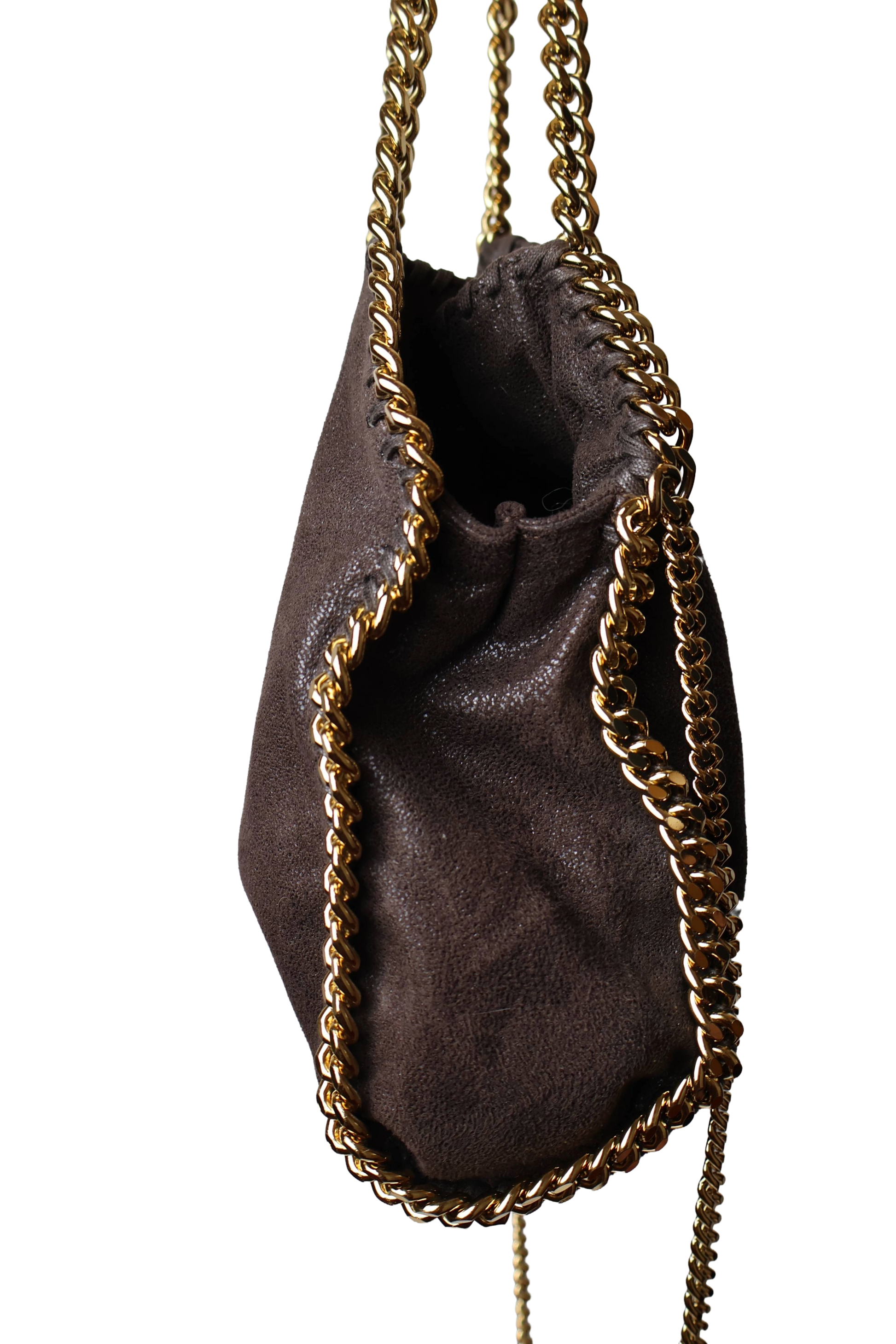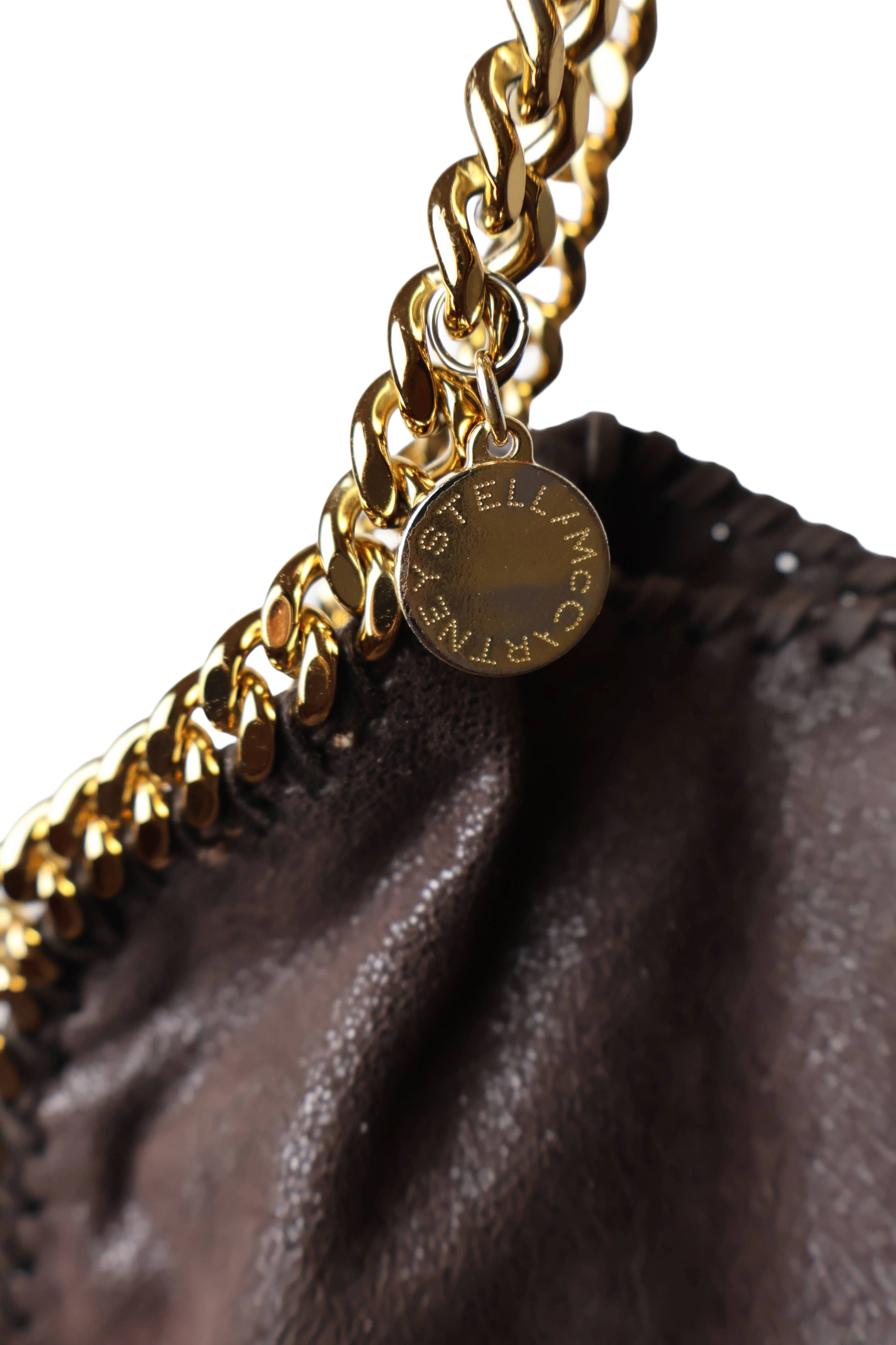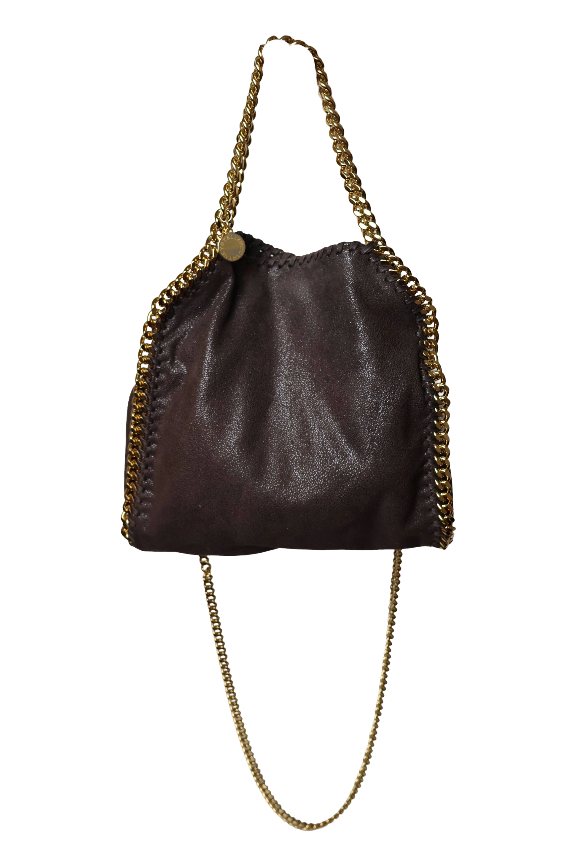 The Falabella mini tote in chocolate brown has two top handles, one shoulder strap, one main compartment, an internal slip pocket, magnetic snap fastening, and an engraved ruthenium logo medallion charm. She´s in e