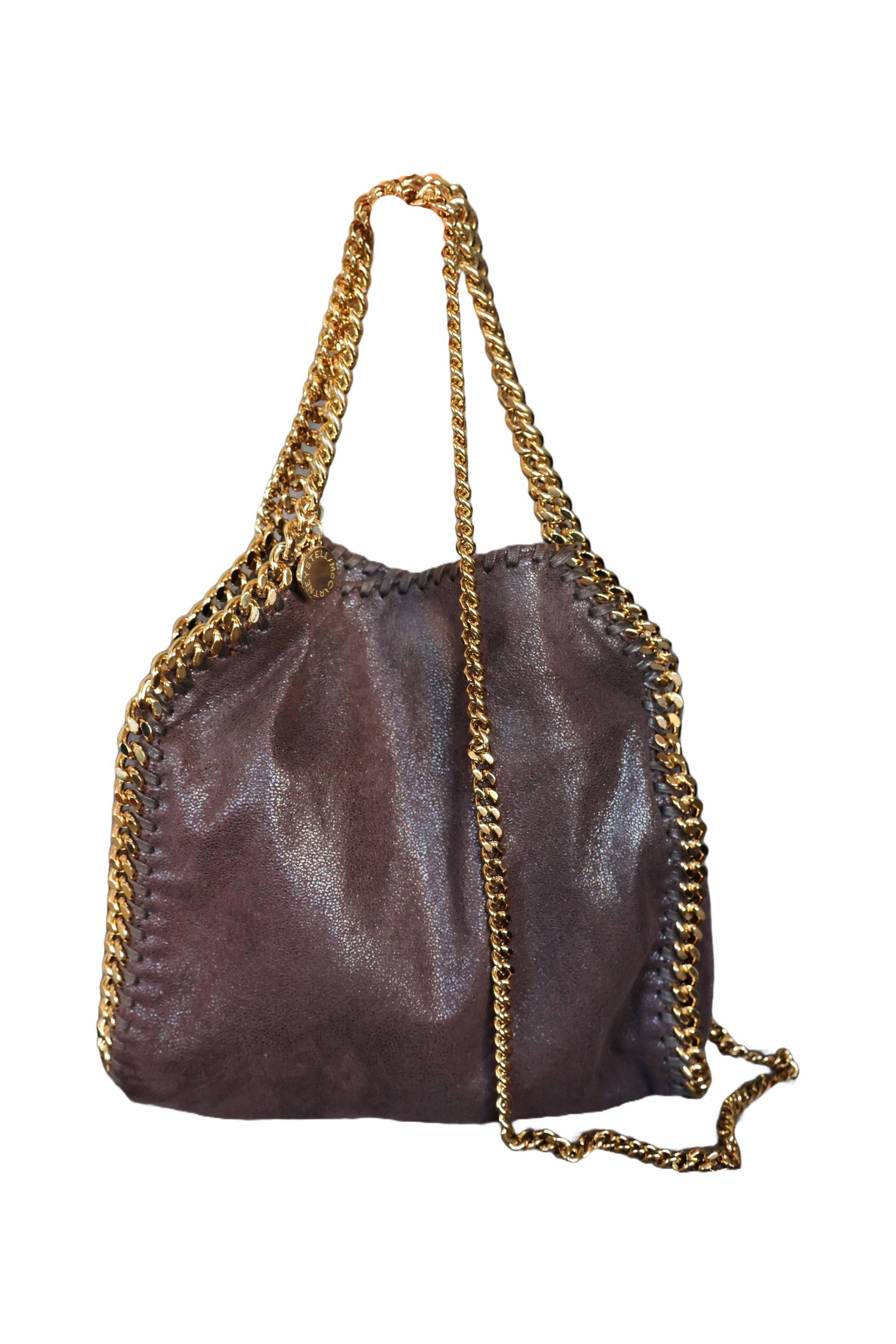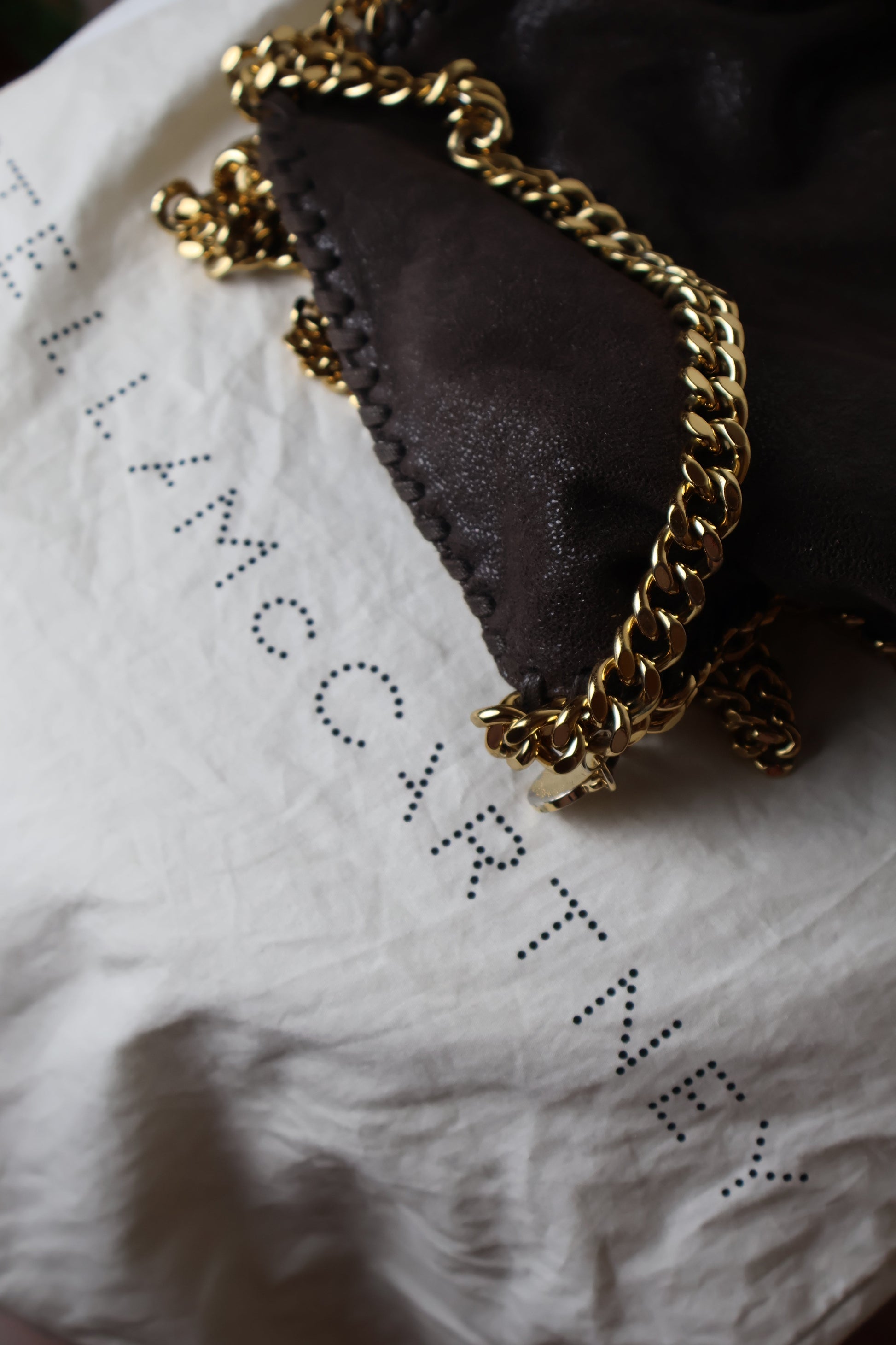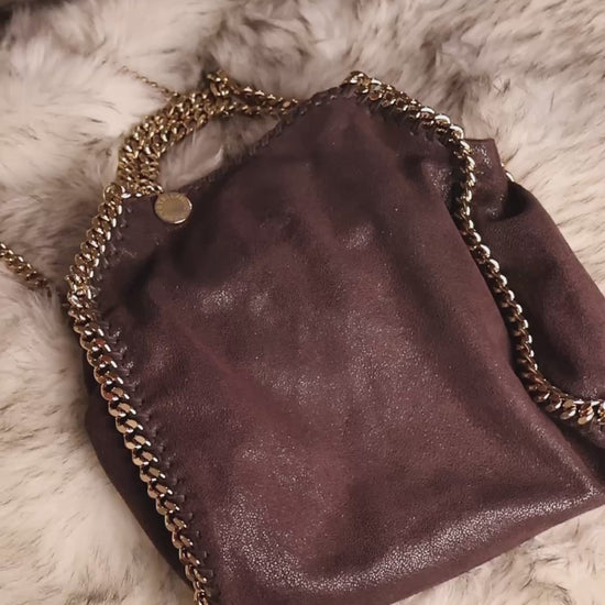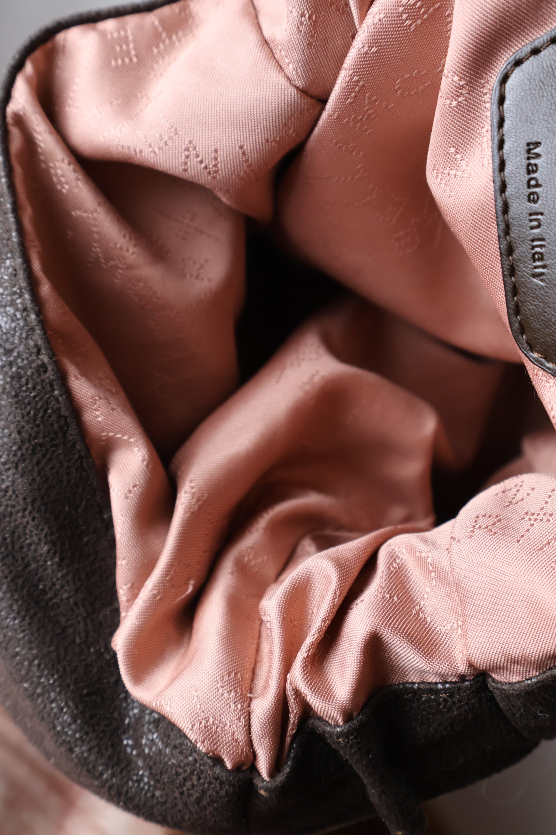 The Falabella mini tote in chocolate brown has two top handles, one shoulder strap, one main compartment, an internal slip pocket, magnetic snap fastening, and an engraved ruthenium logo medallion charm. She´s in e