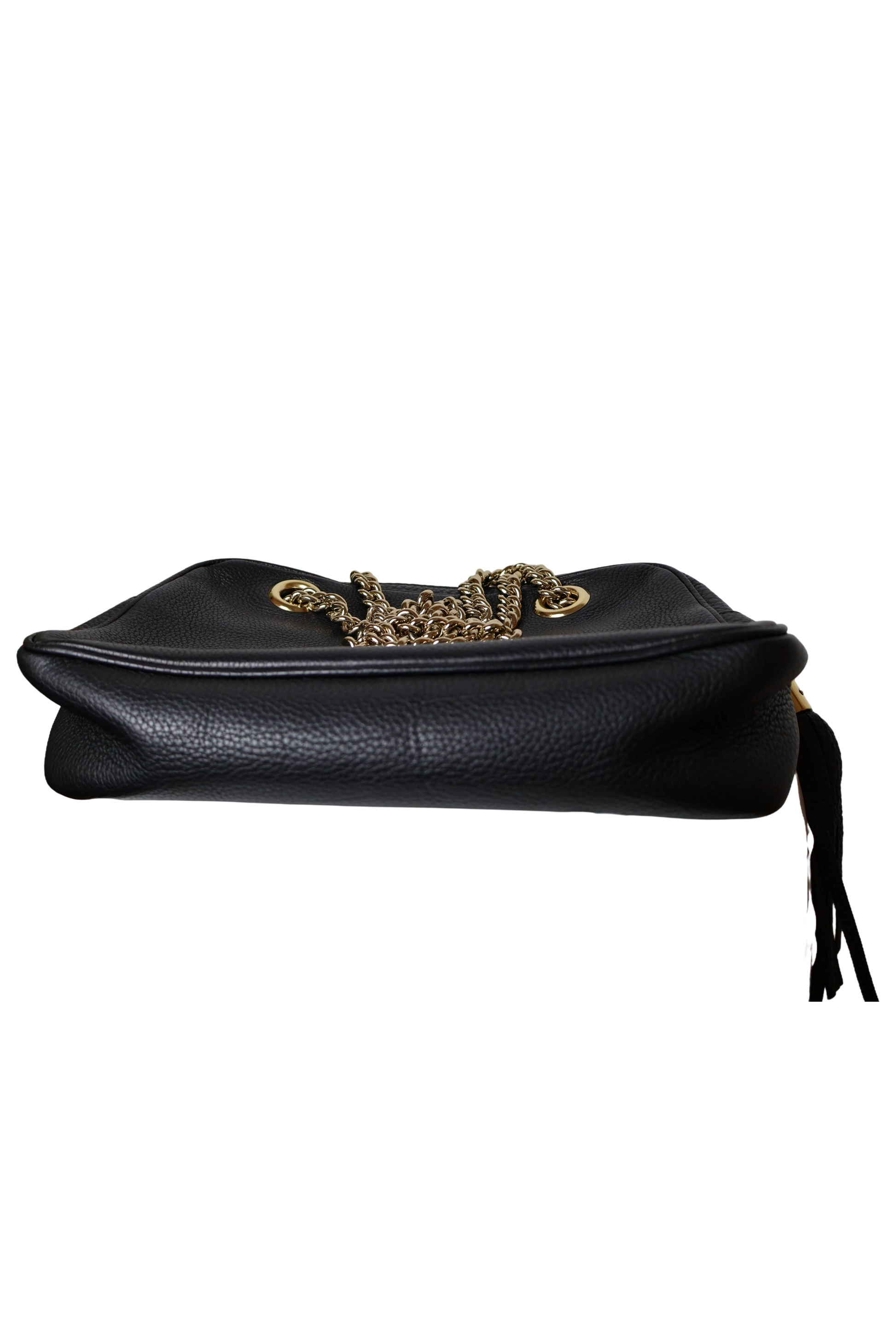 Gucci Medium Soho Chain Bag crafted from black calfskin leather with elegant gold-tone hardware. Features the iconic GG embossed logo and a chic chain shoulder strap for versatile wear. The exterior is in excellent condition, while the interior shows some stains.