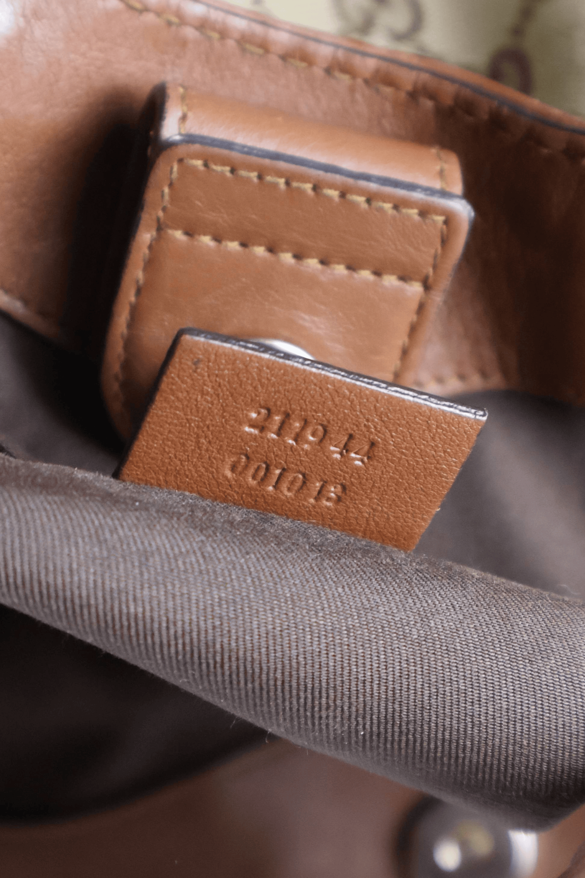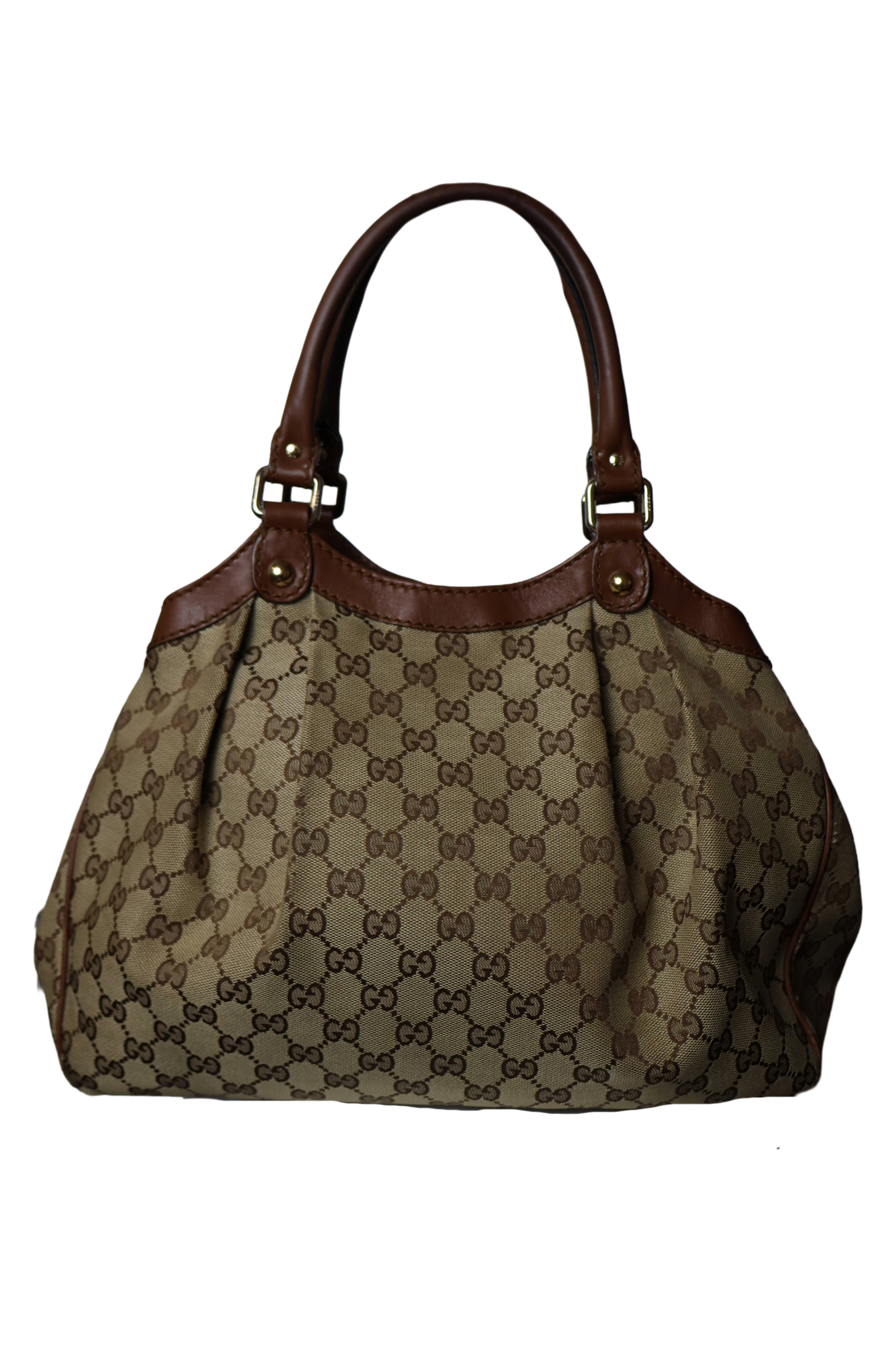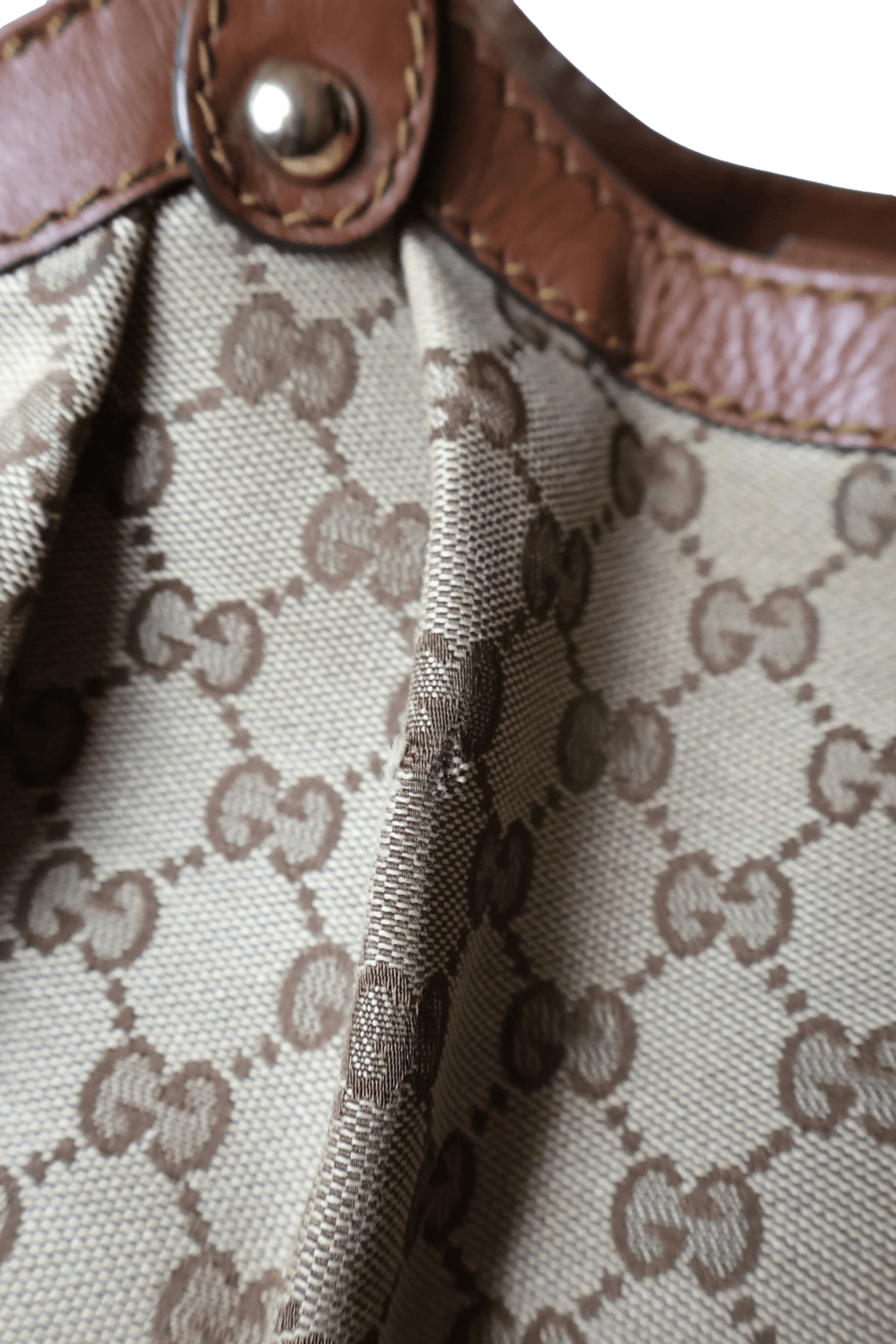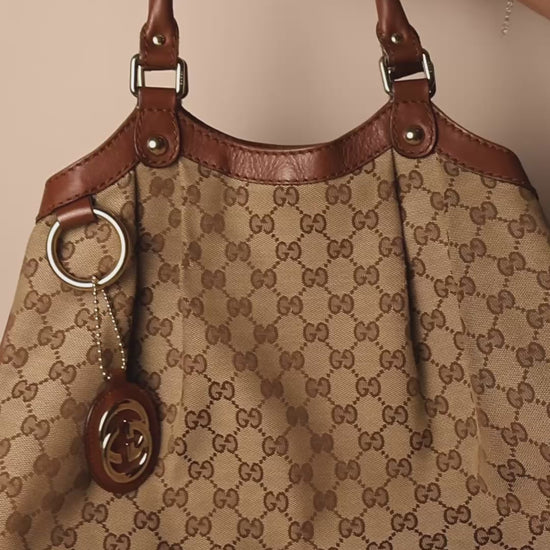 Made from brown GG canvas with matching leather trim, this medium Gucci Sukey Tote features soft pleats and a gold-tone GG charm. Condition: some visible scratches on the canvas; the interior is in excellent condition and very clean. Please review all photos before purchase.
