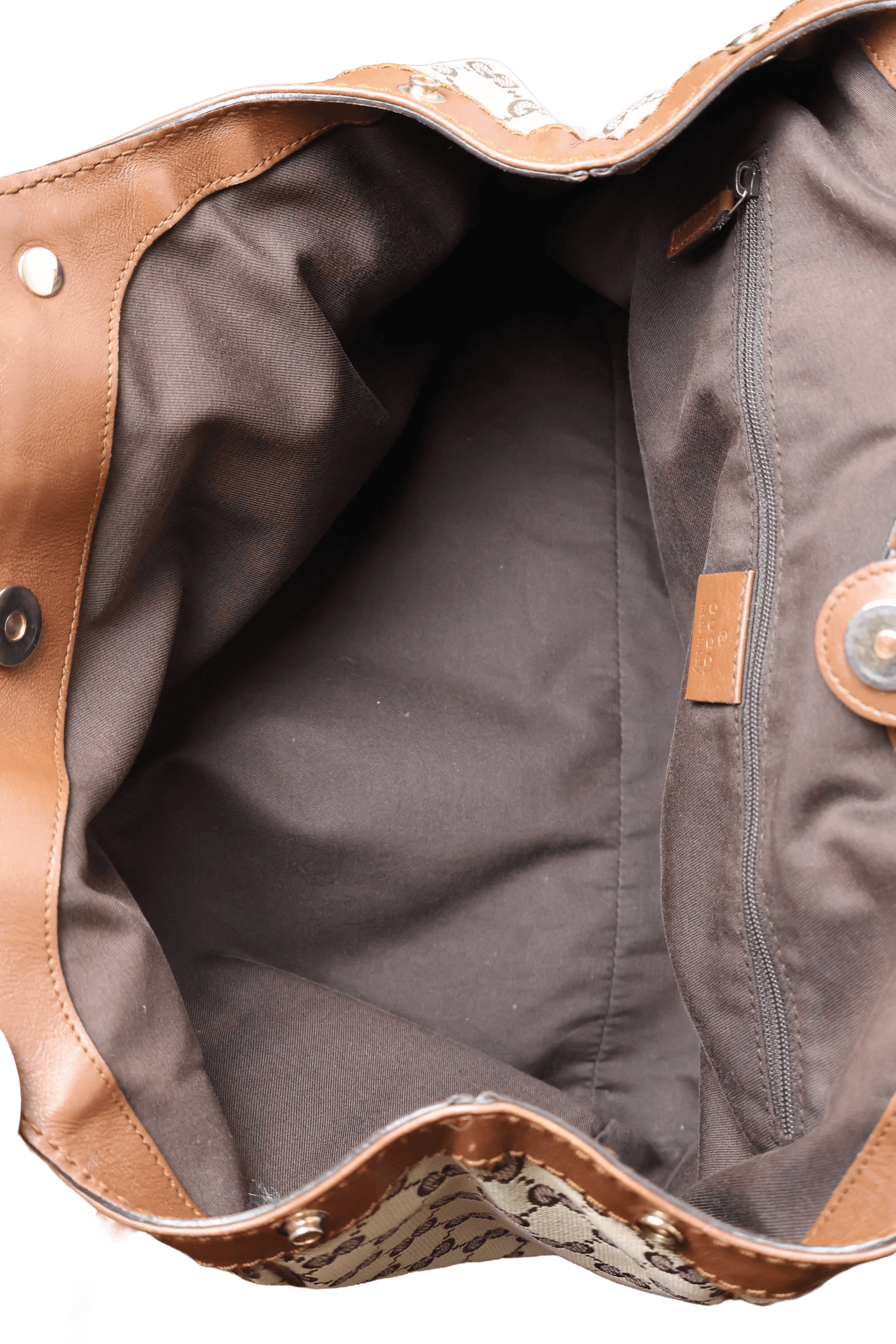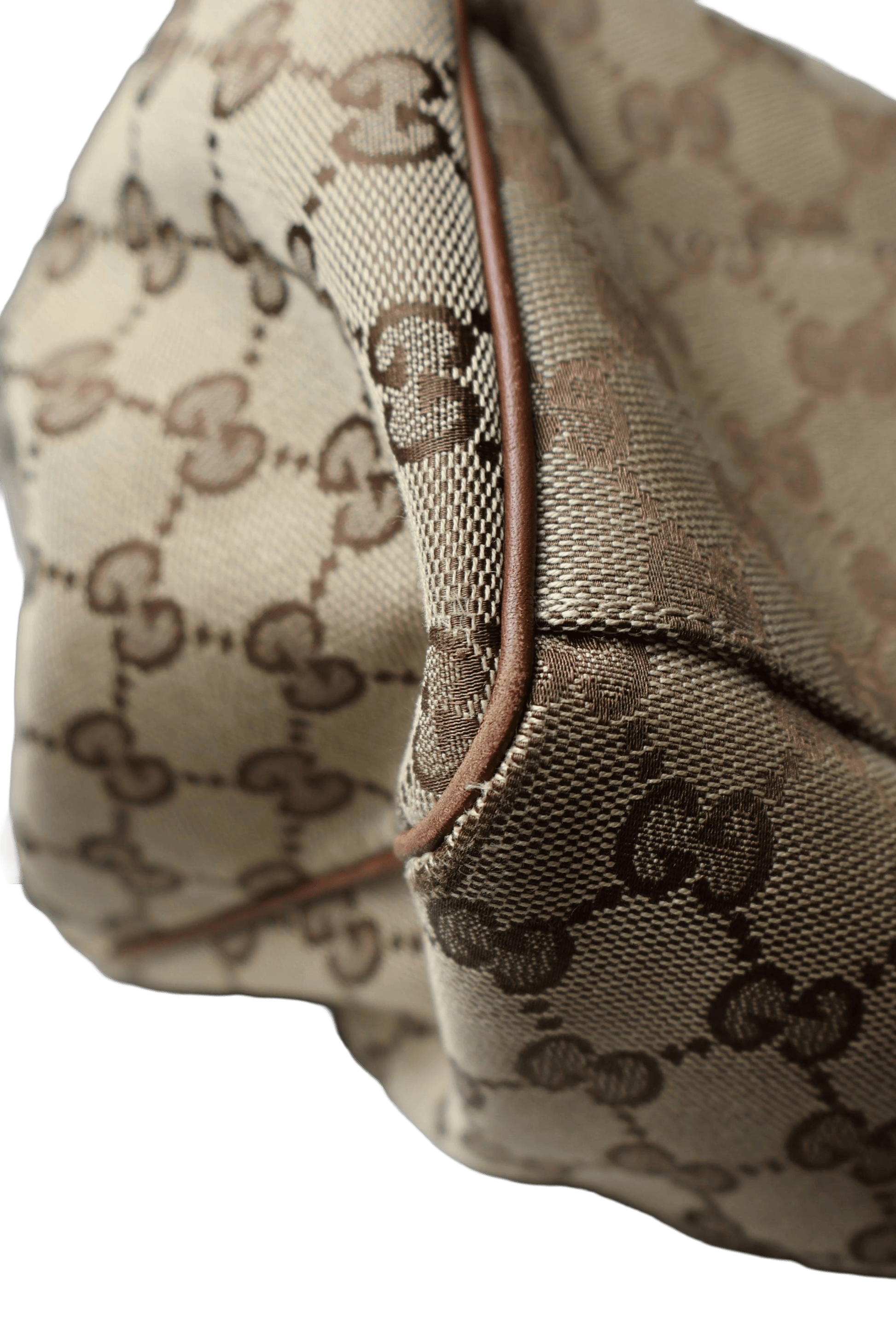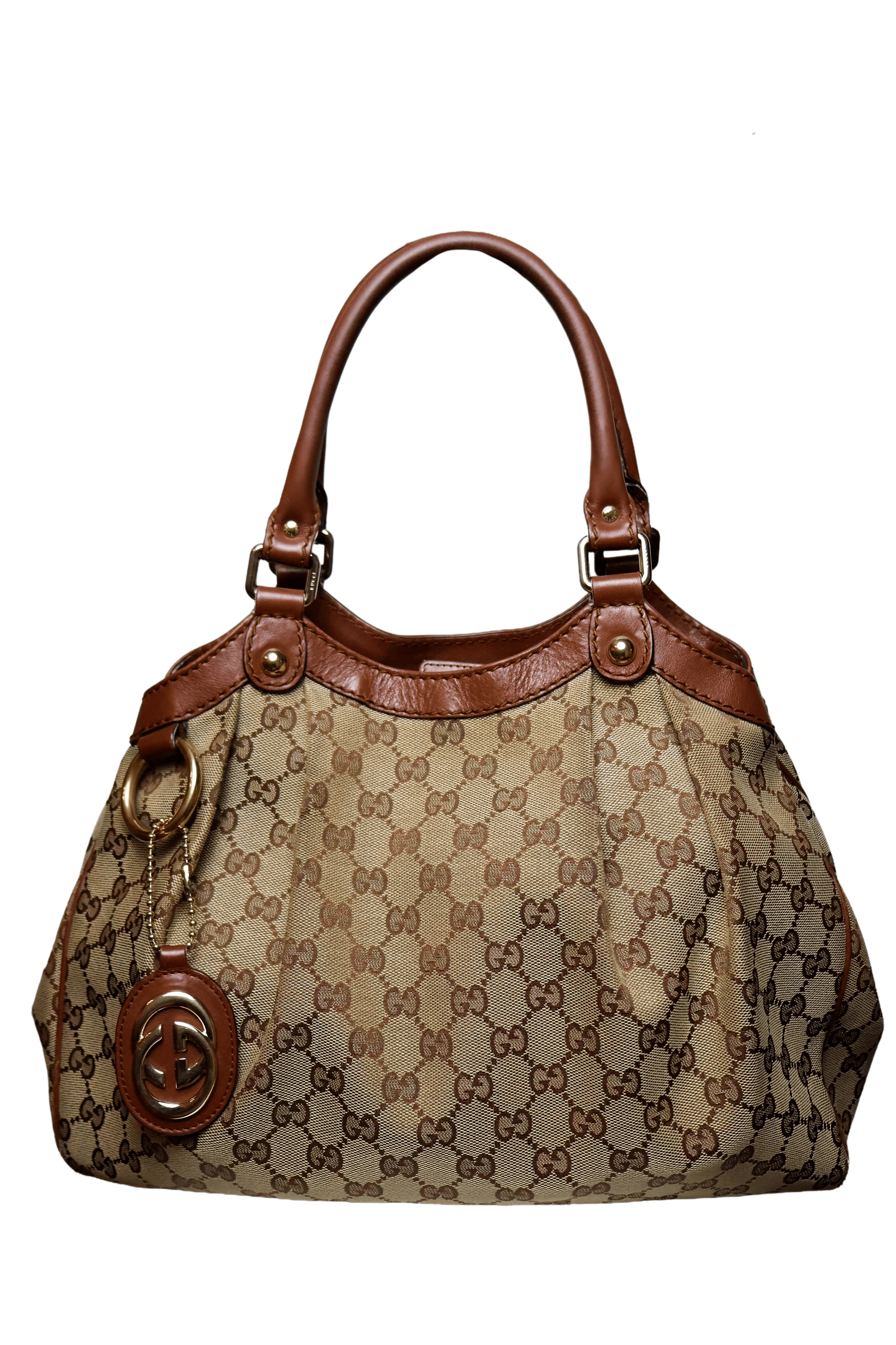 Made from brown GG canvas with matching leather trim, this medium Gucci Sukey Tote features soft pleats and a gold-tone GG charm. Condition: some visible scratches on the canvas; the interior is in excellent condition and very clean. Please review all photos before purchase.