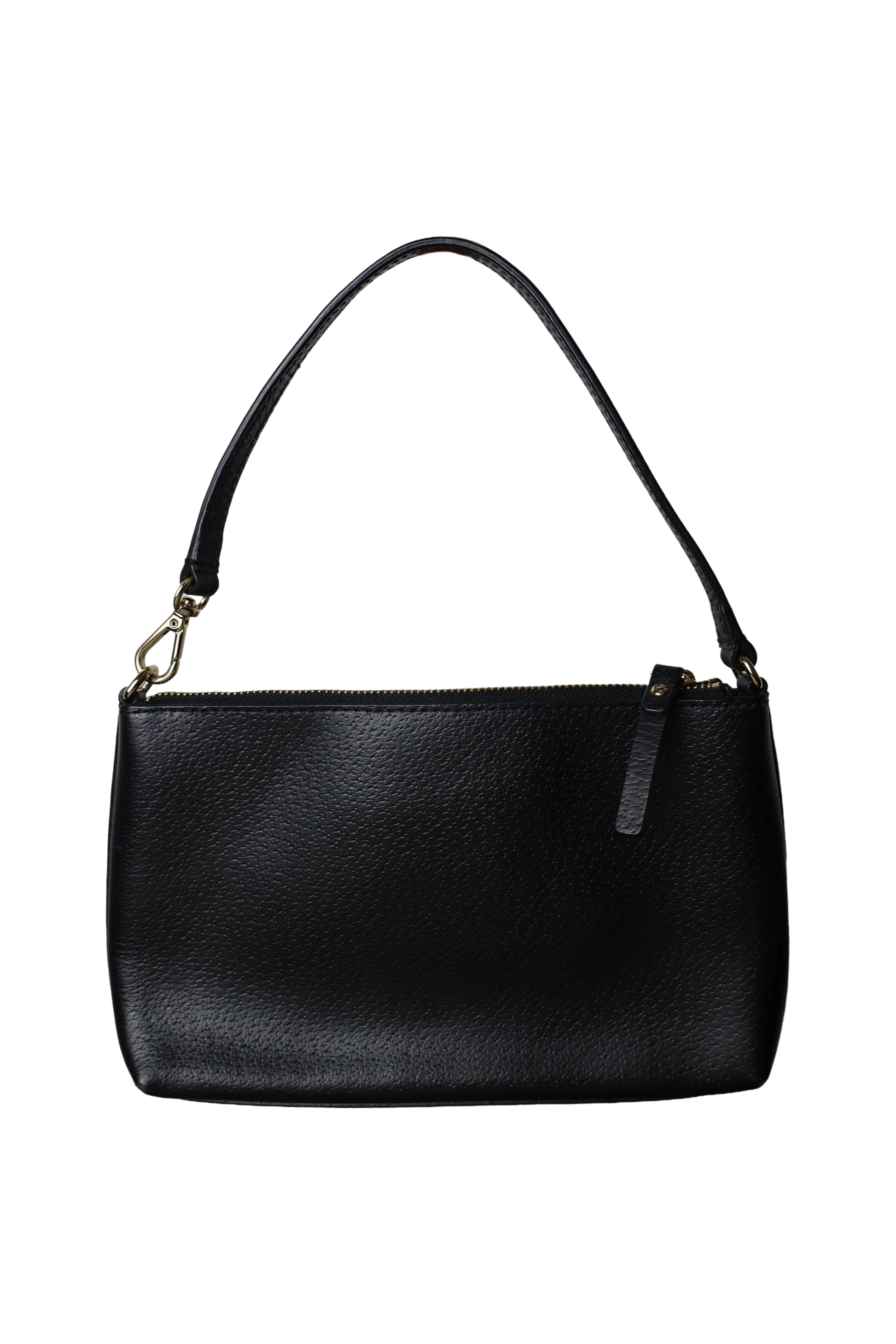 Kate Spade Small Shoulder Bag in black leather with gold hardware. Sleek and compact, perfect for essentials, featuring a structured silhouette.