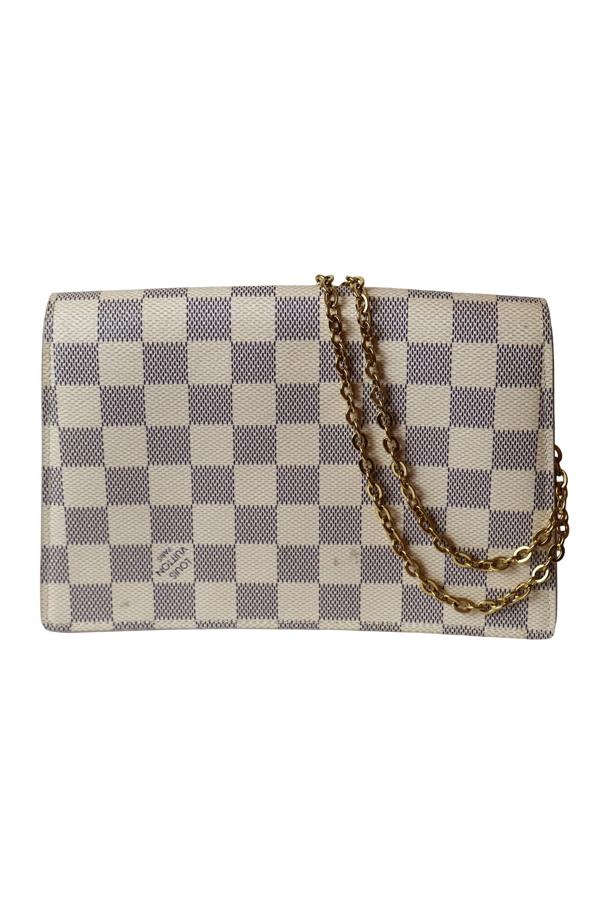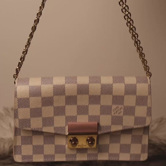 Crafted in Damier Azur canvas with leather details and gold-tone hardware, this elegant Louis Vuitton Croisette Chain features a clasp closure and a detachable chain strap for crossbody or shoulder wear. Compact yet functional, it includes a zip pocket, two open compartments, and multiple card slots.