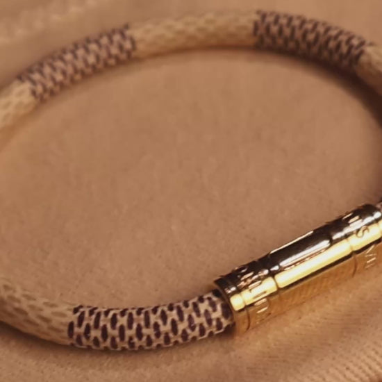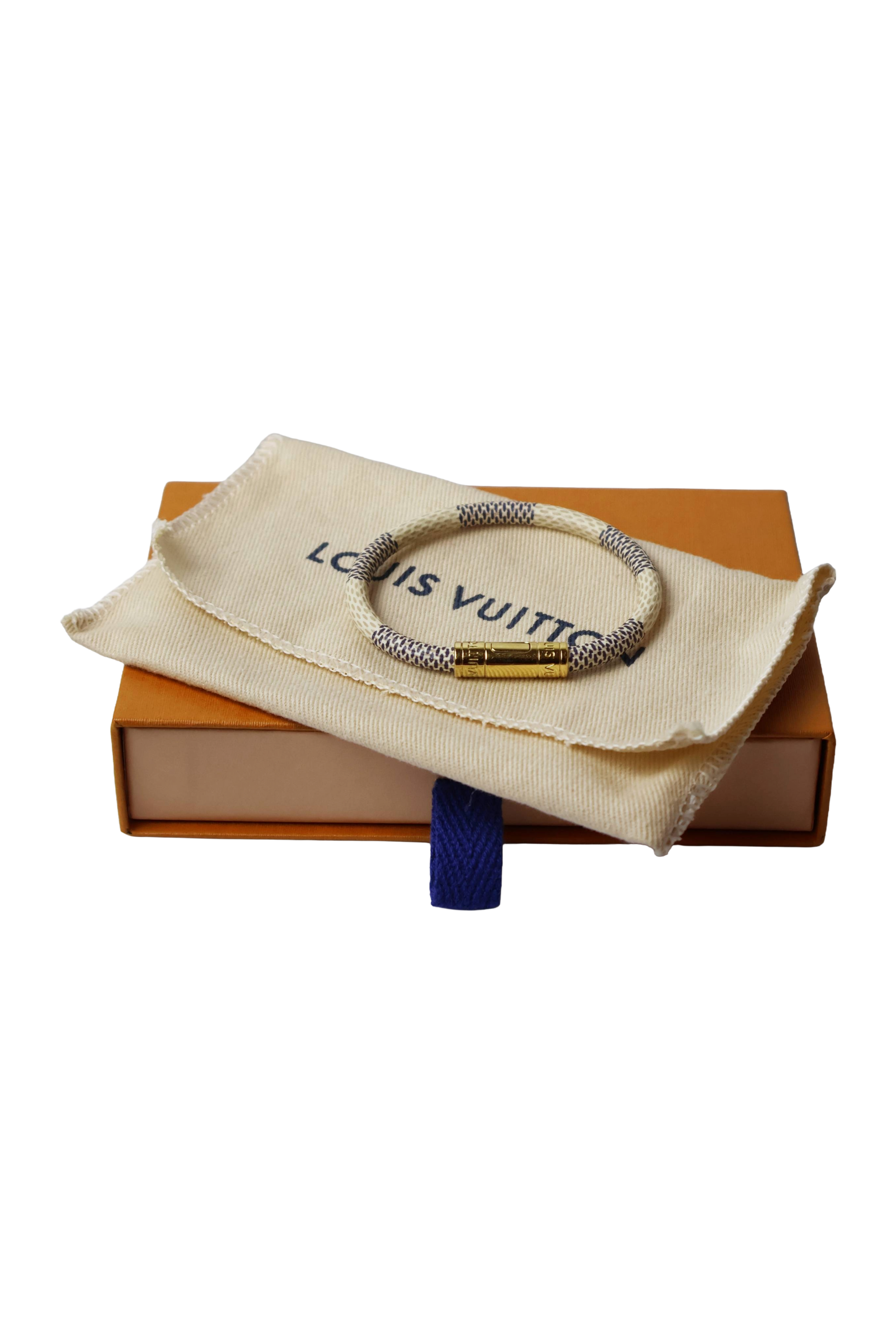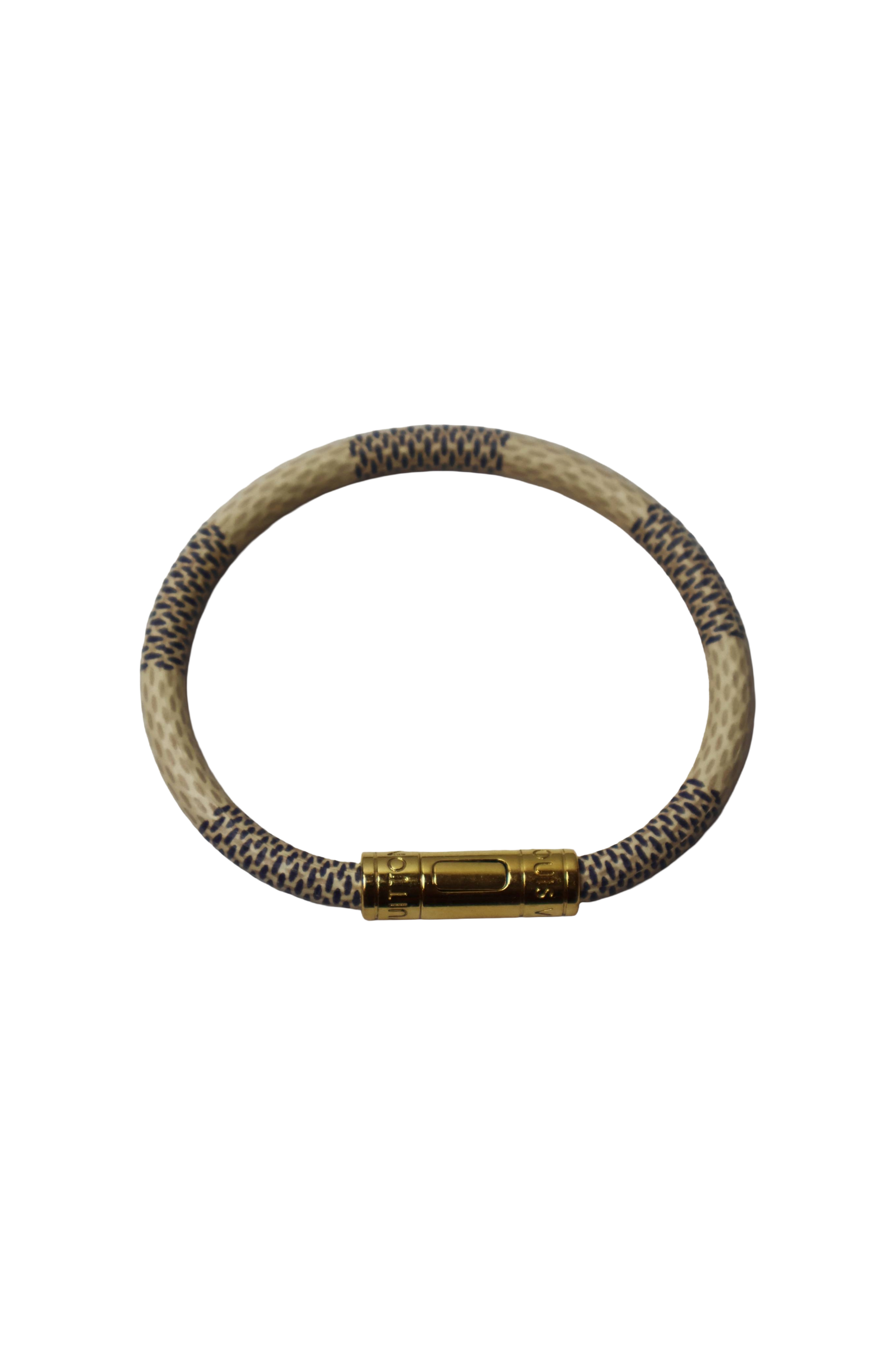 Experience the timeless elegance of the Louis Vuitton Keep It Bracelet Damier Azur. Crafted from durable coated canvas and accented with polished gold-tone hardware, it showcases a refined palette of grey, white, and gold that enhances any look. A sophisticated accessory to elevate your collection.
