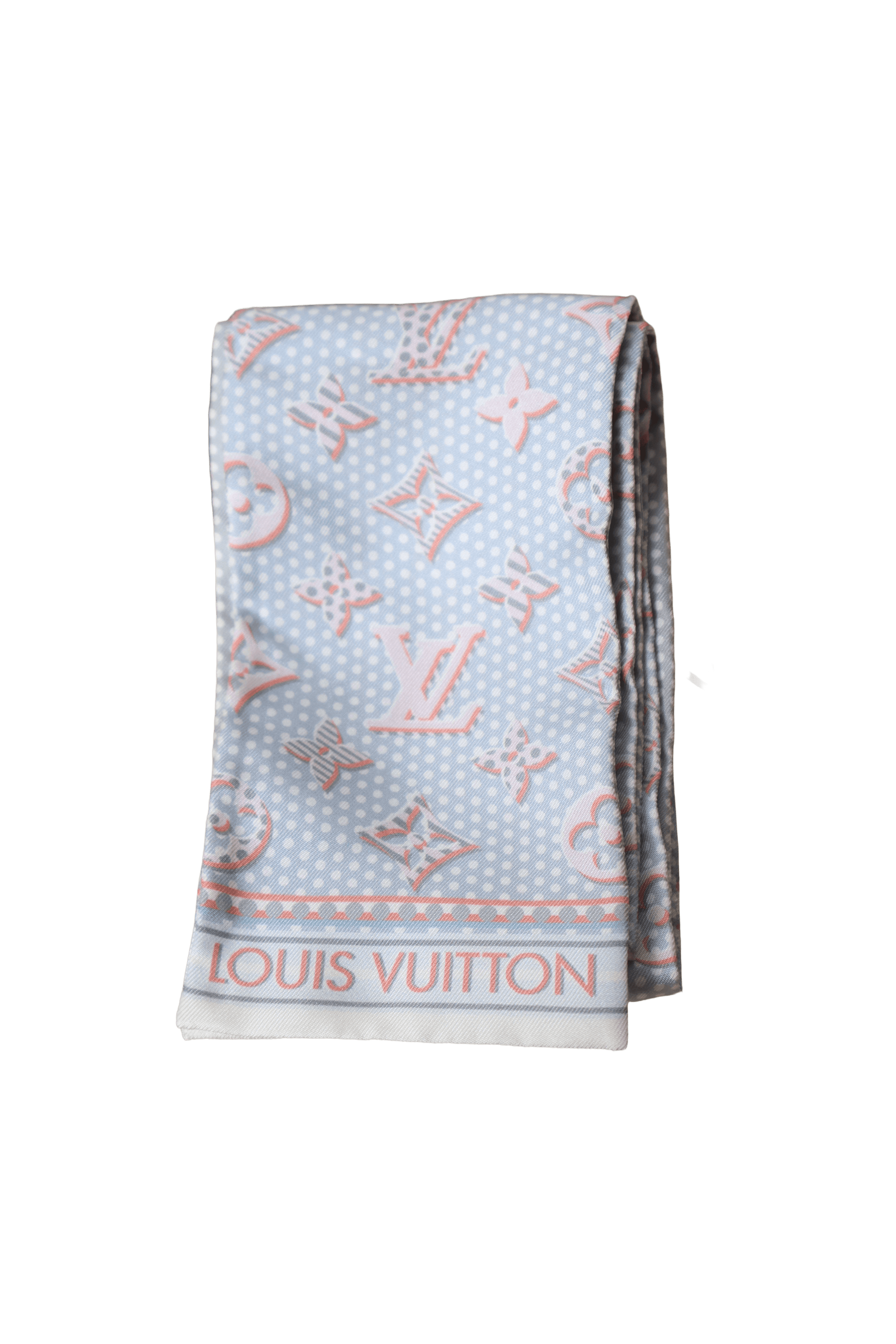 Crafted from pure silk, this Louis Vuitton scarf features the iconic Monogram in soft pastel tones with playful dots. Elegant, feminine, and versatile — perfect to wear around the neck, in the hair, or tied to a bag handle.