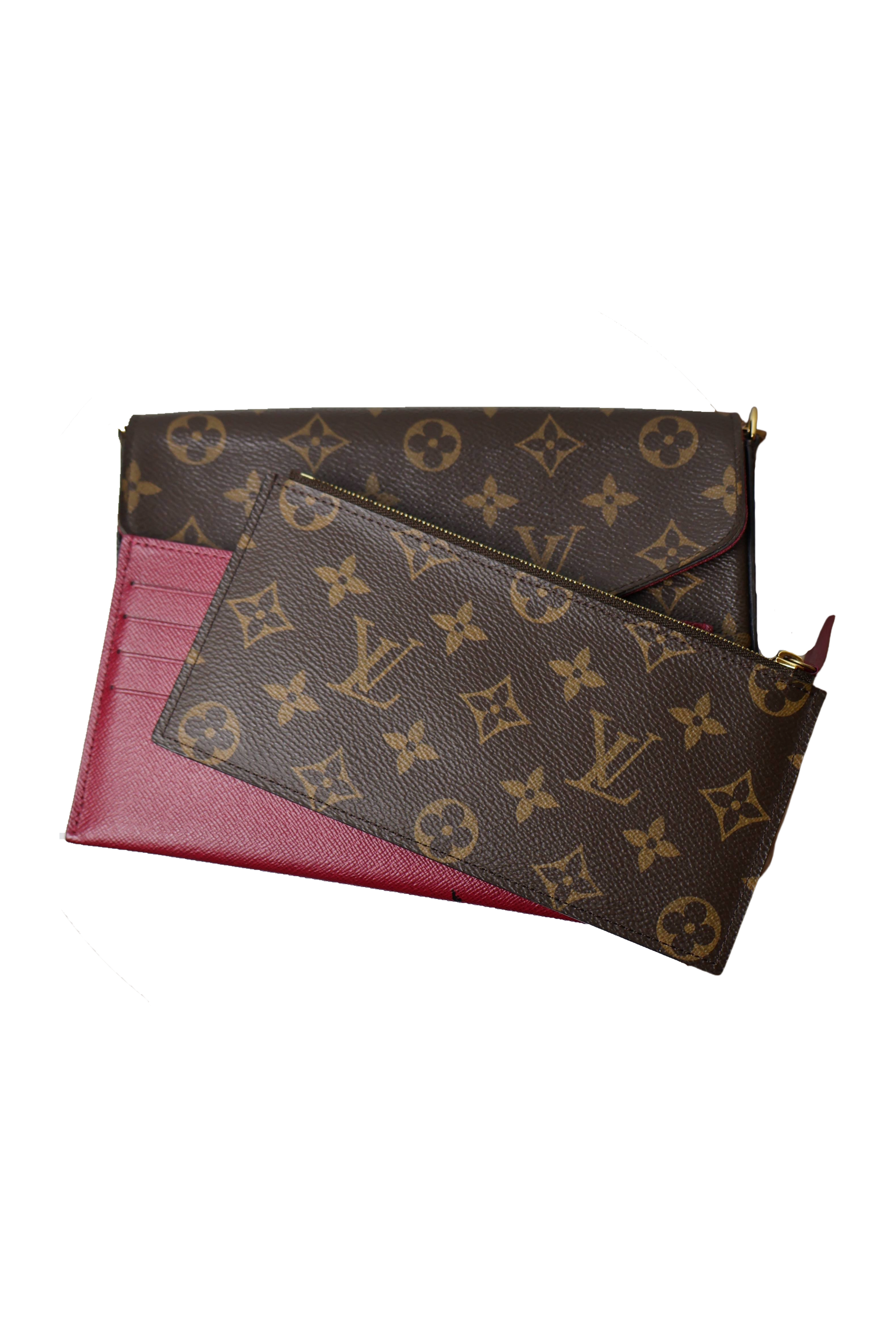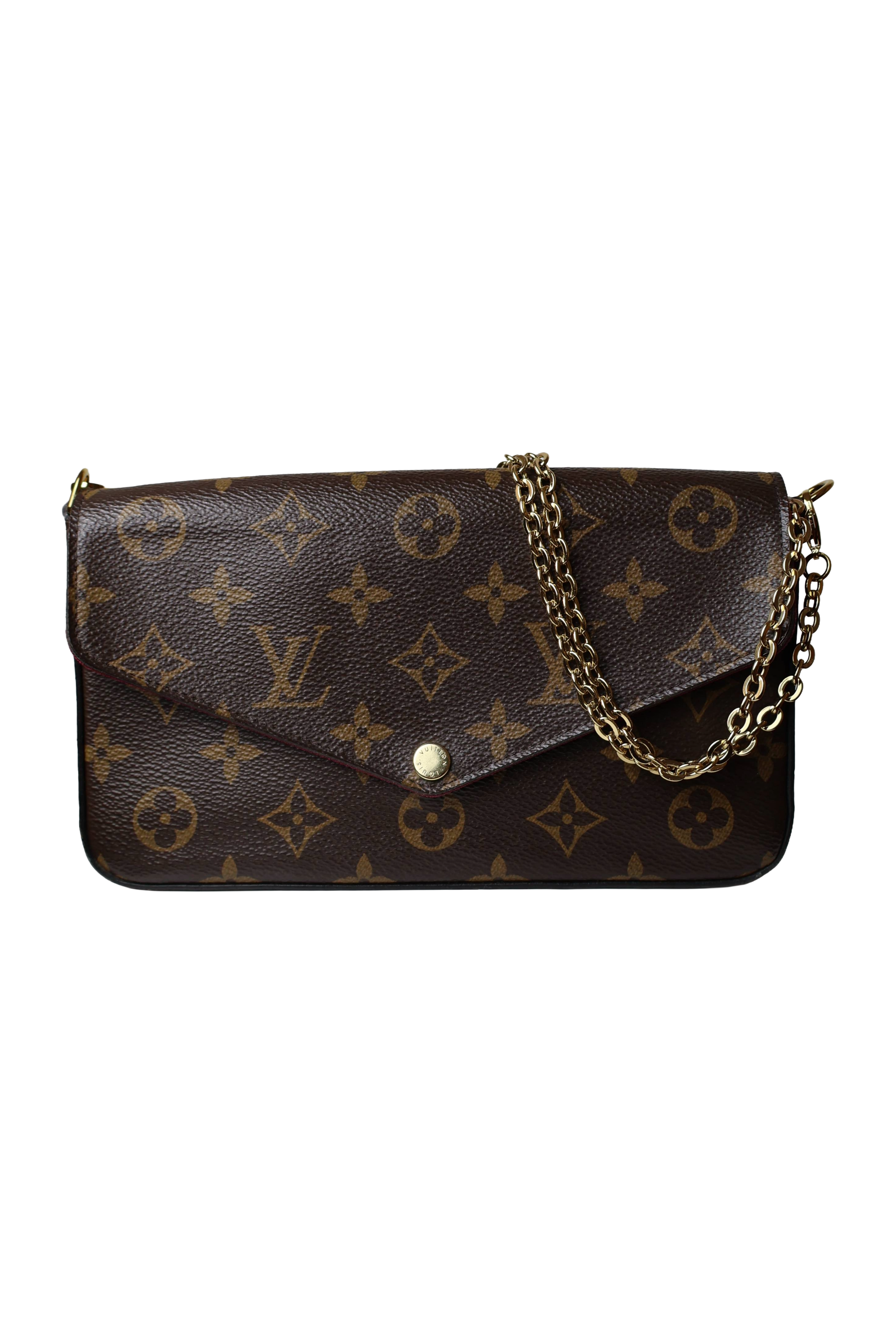 Louis Vuitton Pochette Félicie, a chic and functional accessory in Monogram canvas with a refined envelope silhouette. The roomy interior includes two removable inserts: a zippered pouch and a cardholder. Versatile, it can be worn crossbody, on the shoulder with the chain, or carried as a clutch without it.