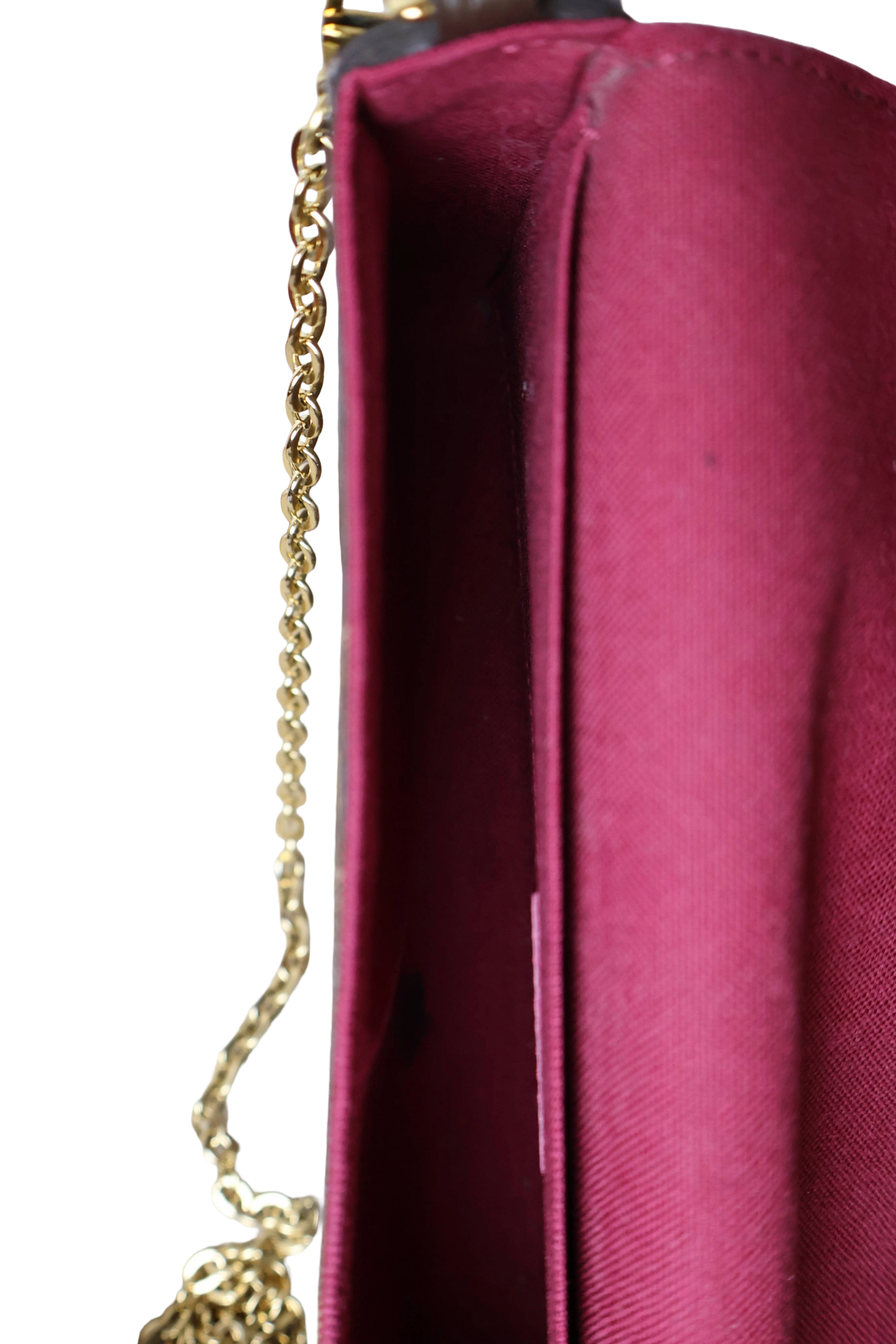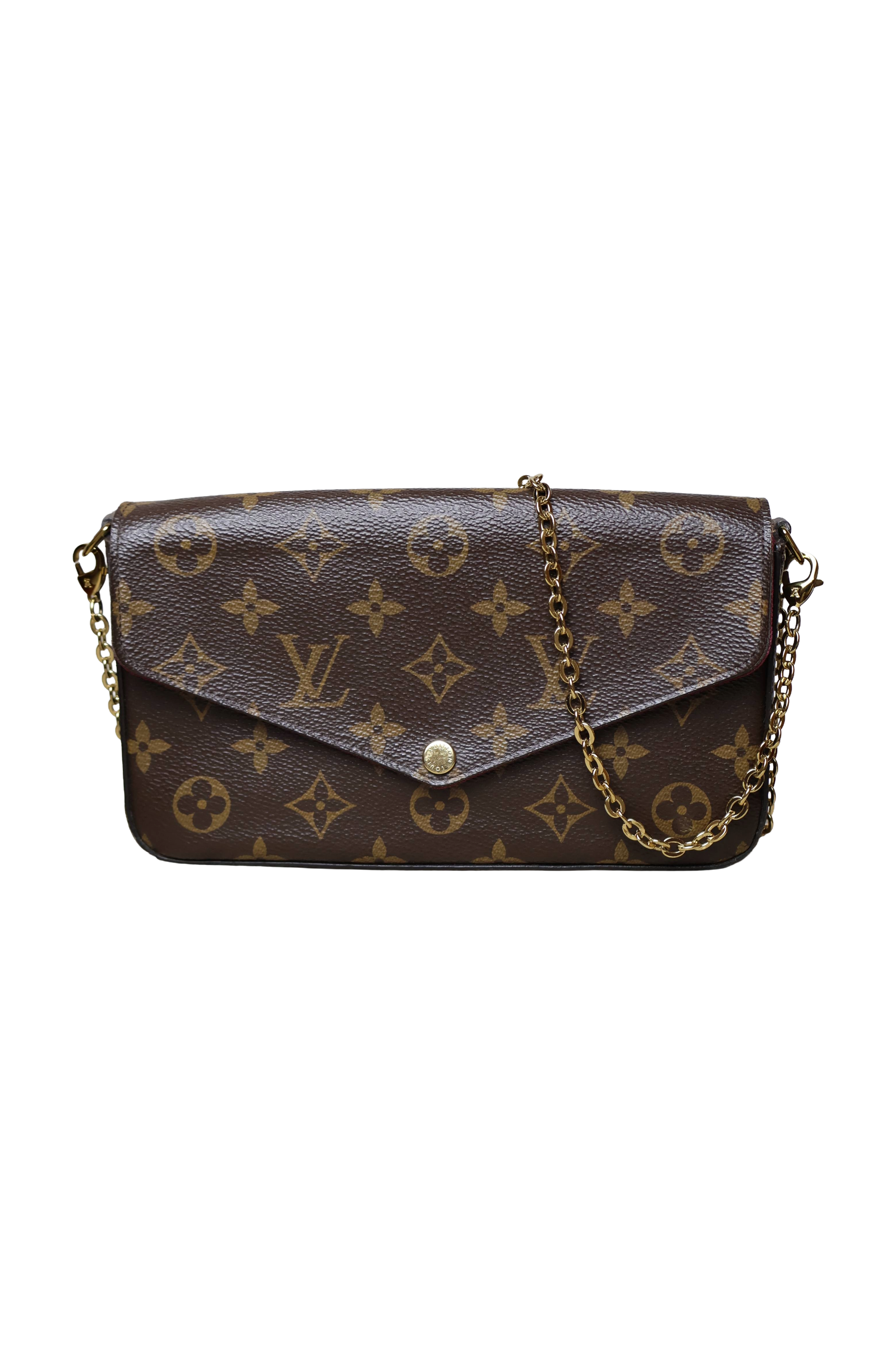 Louis Vuitton Pochette Félicie, a chic and functional bag in Monogram canvas with a refined envelope silhouette. The roomy interior includes two removable inserts: a zippered pouch and a cardholder. Versatile, it can be worn crossbody, on the shoulder with the chain, or carried as a clutch without it.