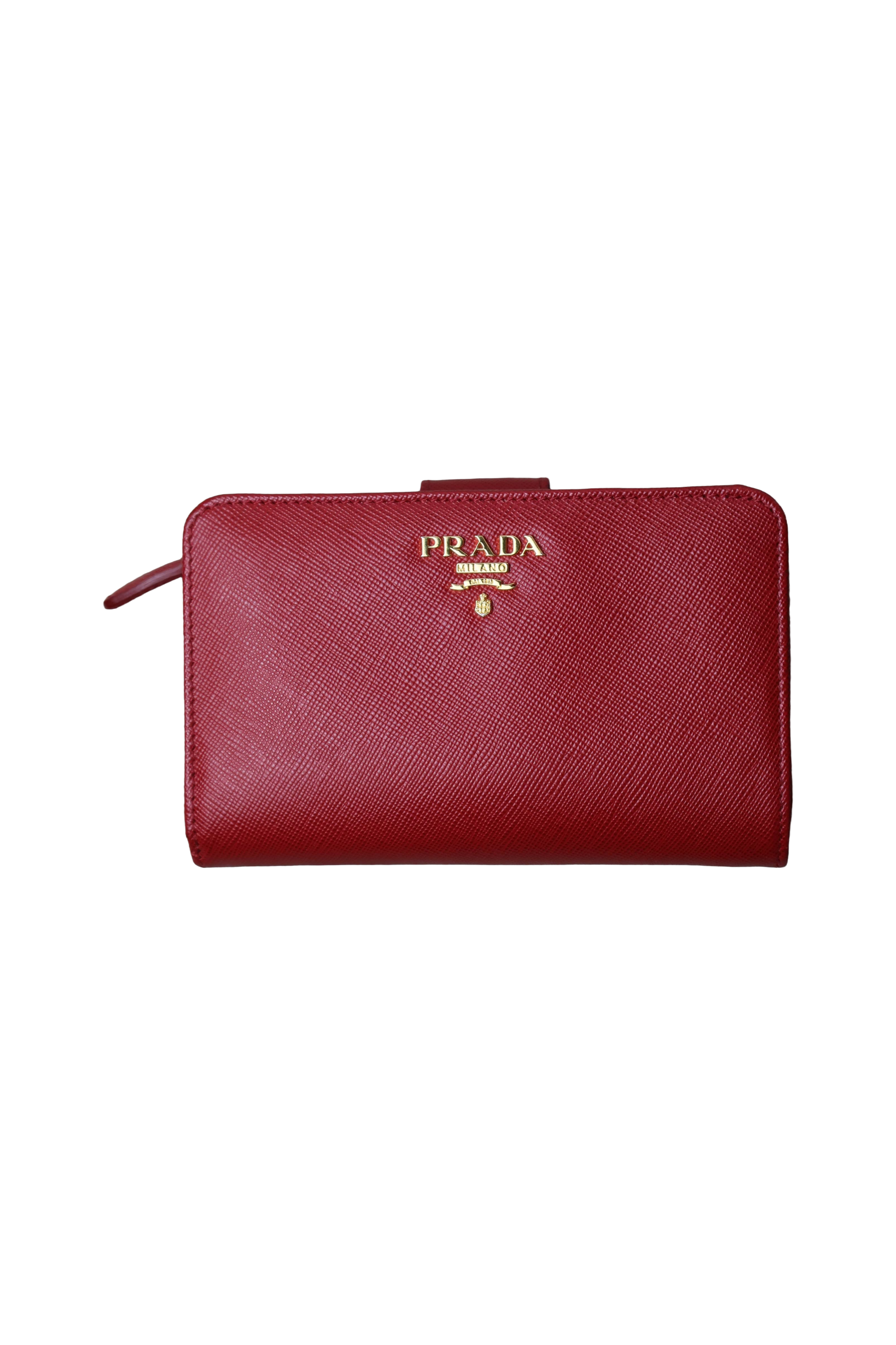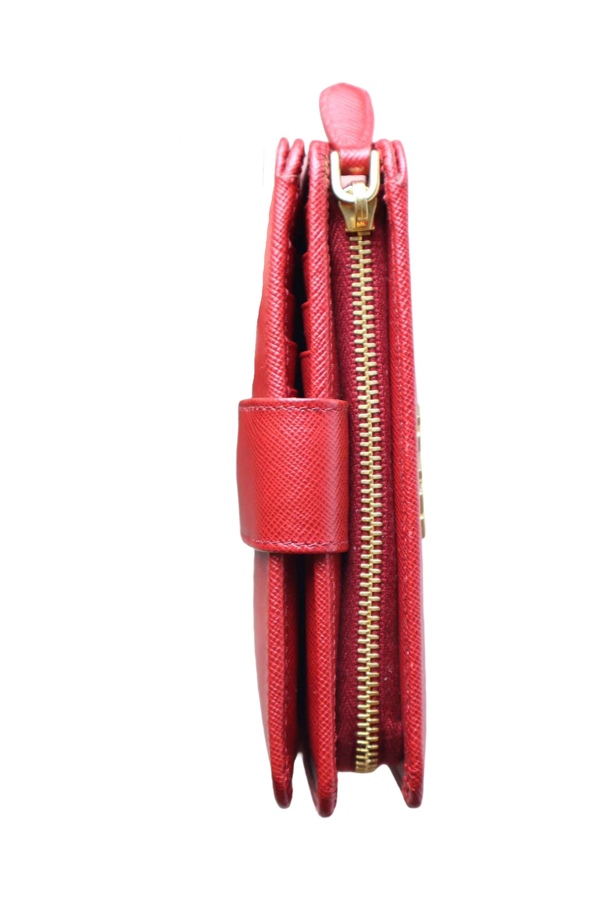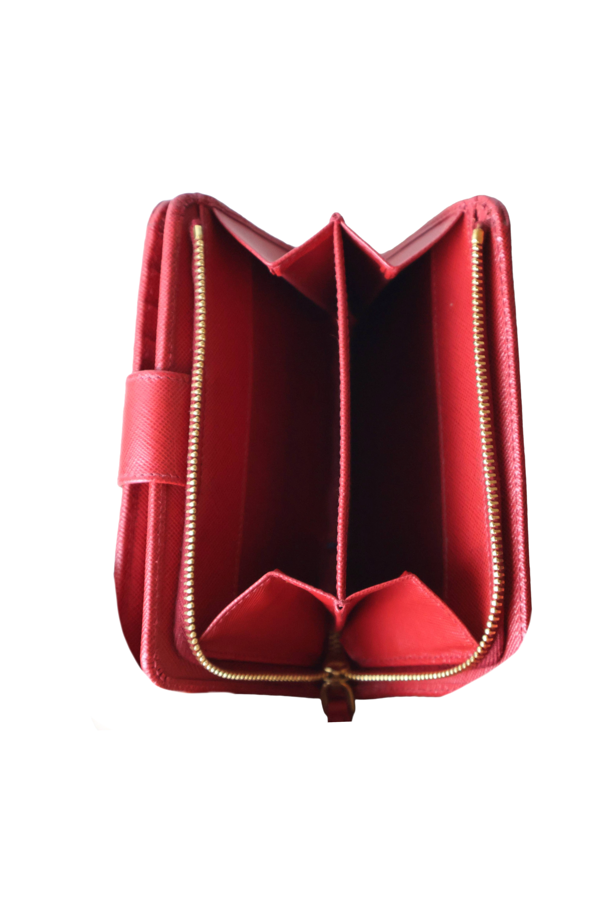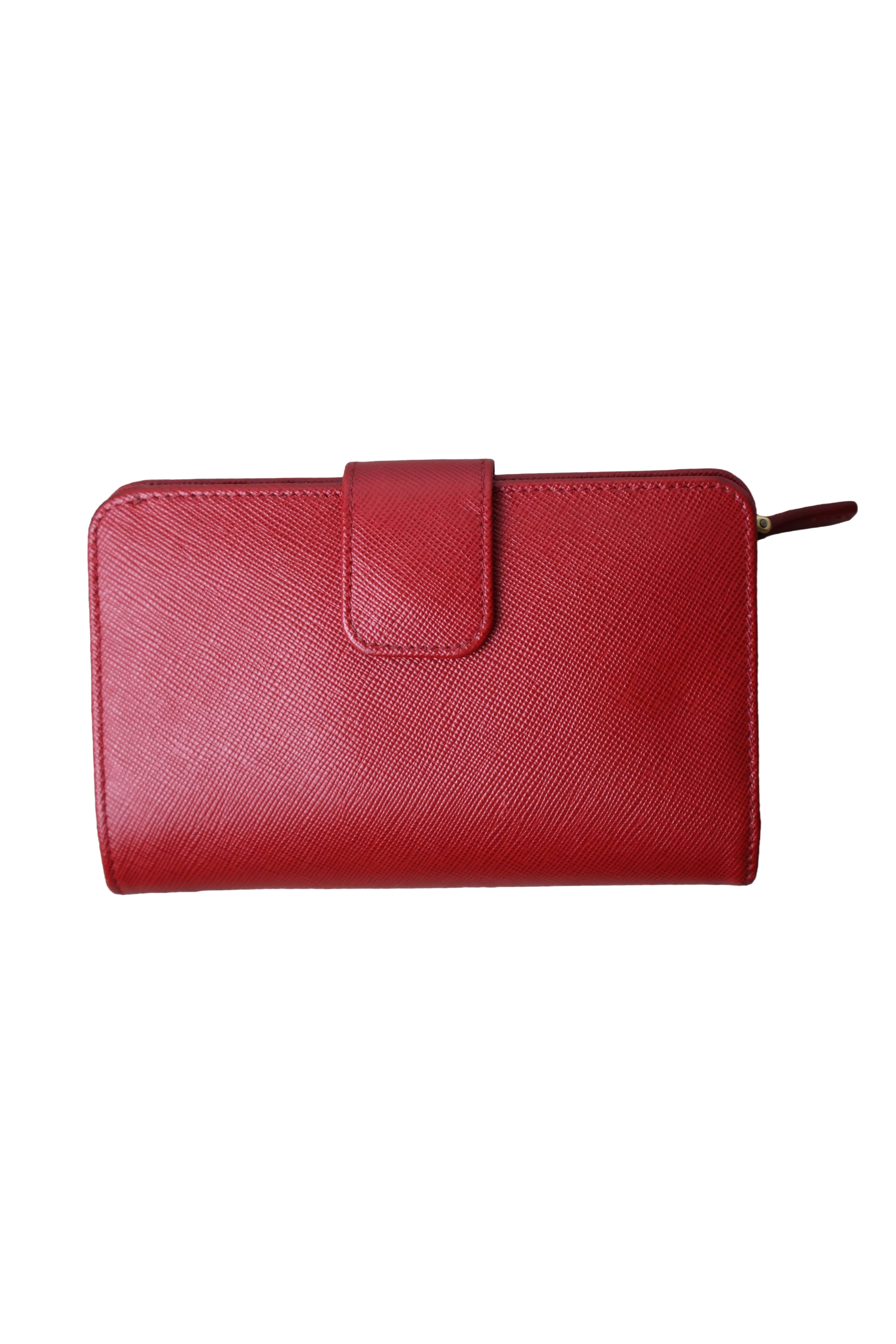 A stunning Prada Saffiano Leather Wallet in vibrant red, featuring gold-tone hardware and the brand’s iconic textured leather. This compact piece offers timeless elegance, exceptional durability and a highly functional interior.