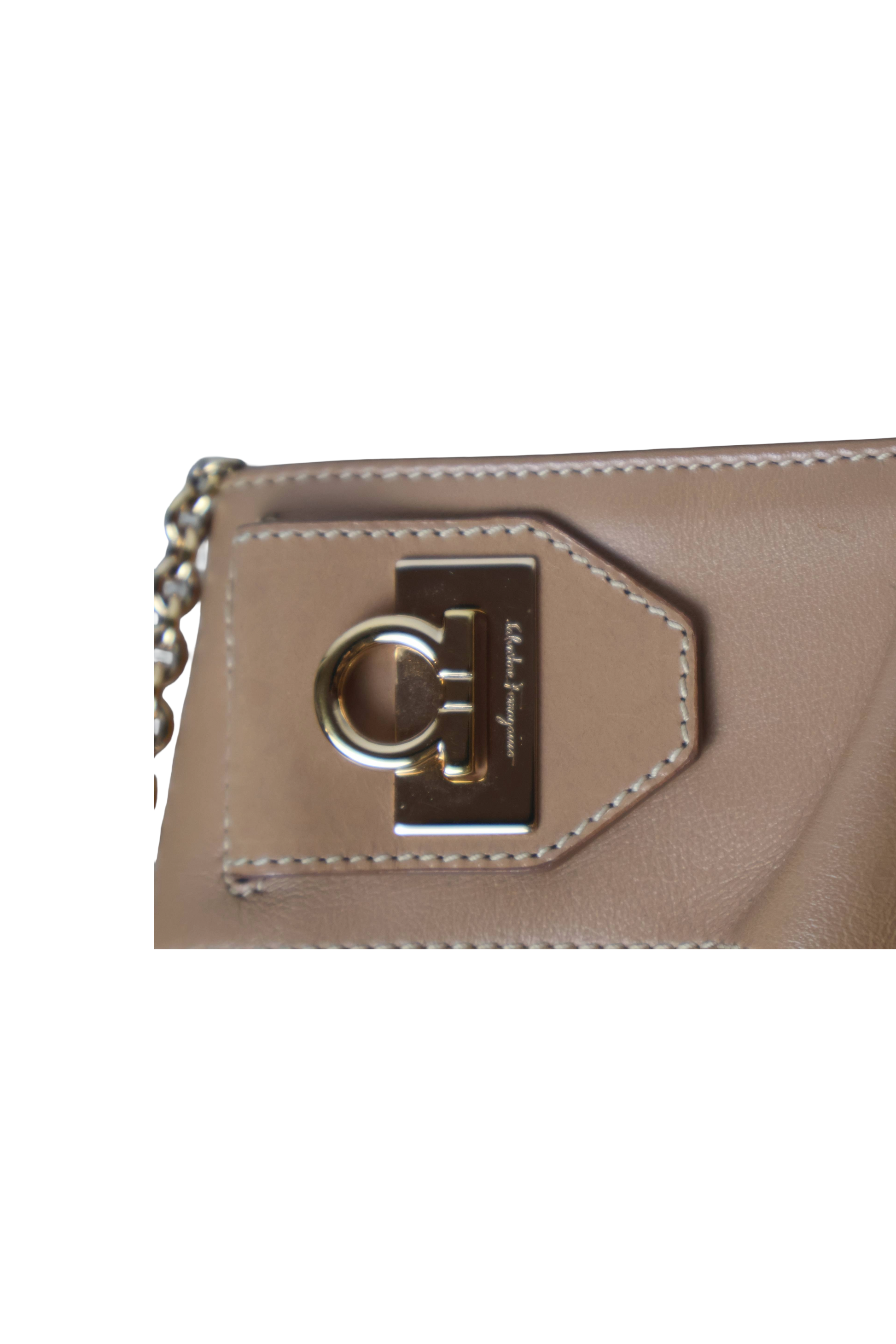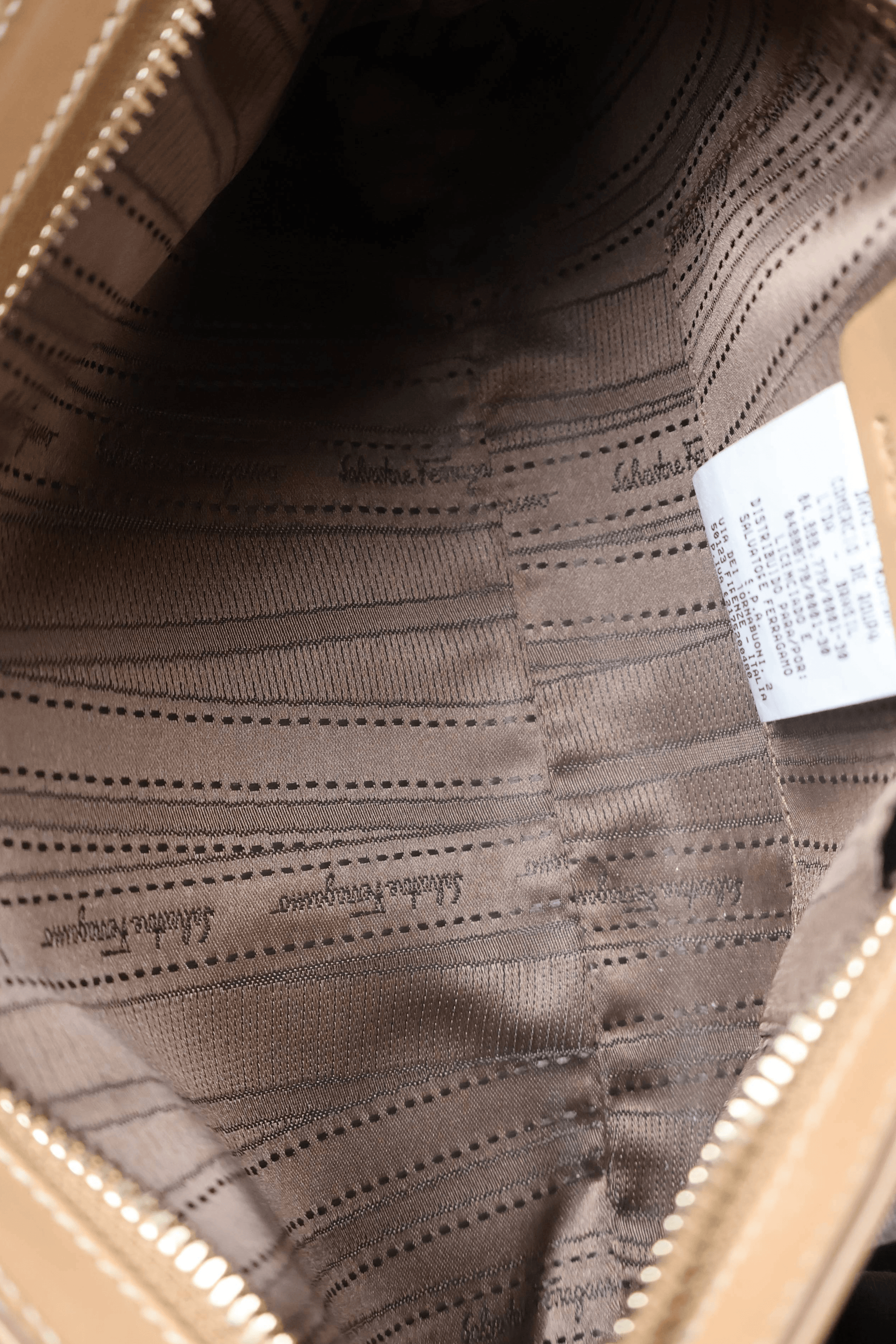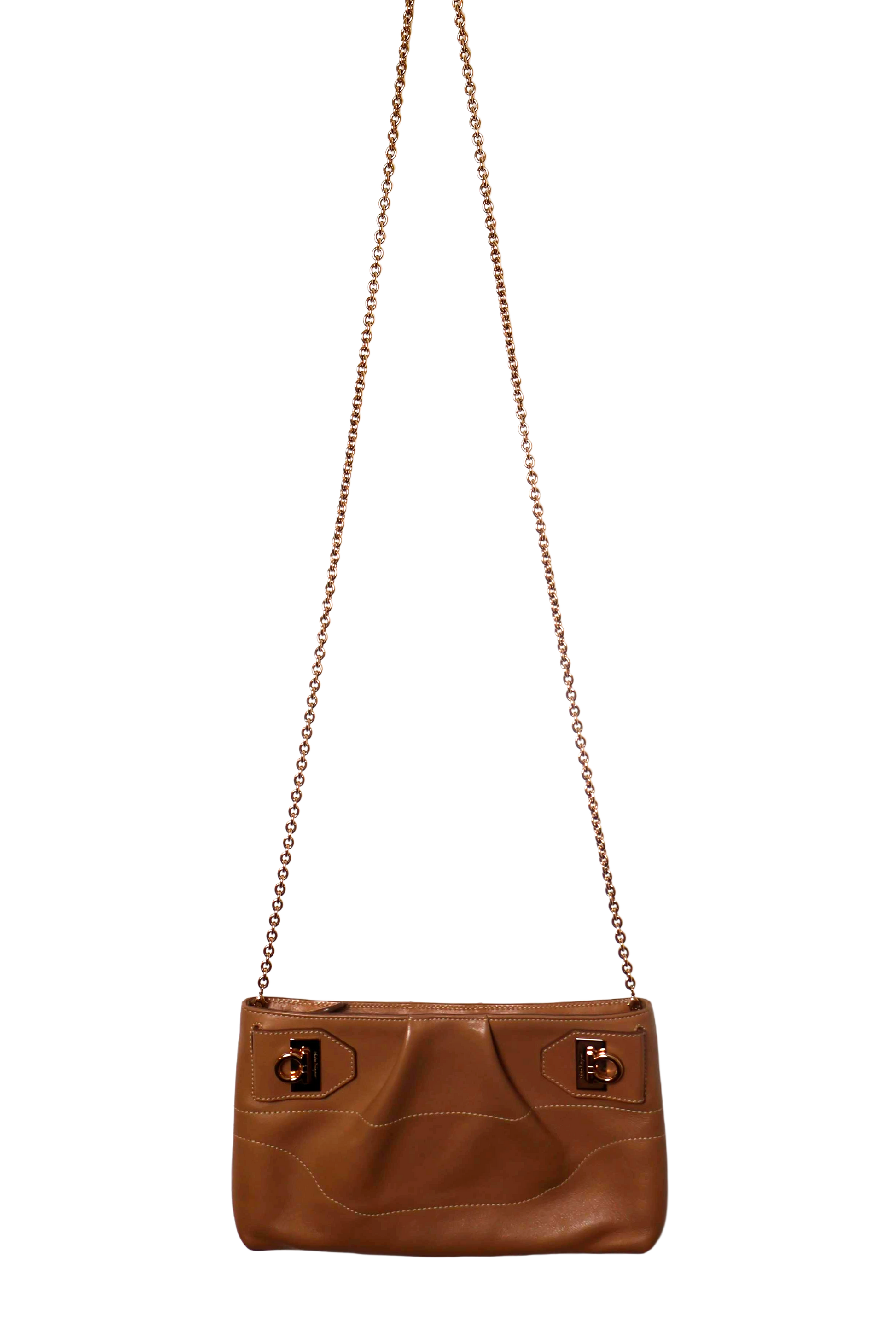 Crafted from smooth camel leather with gold-tone hardware, this Ferragamo bag combines timeless elegance and versatility. Its sleek silhouette transitions effortlessly from day to evening wear.