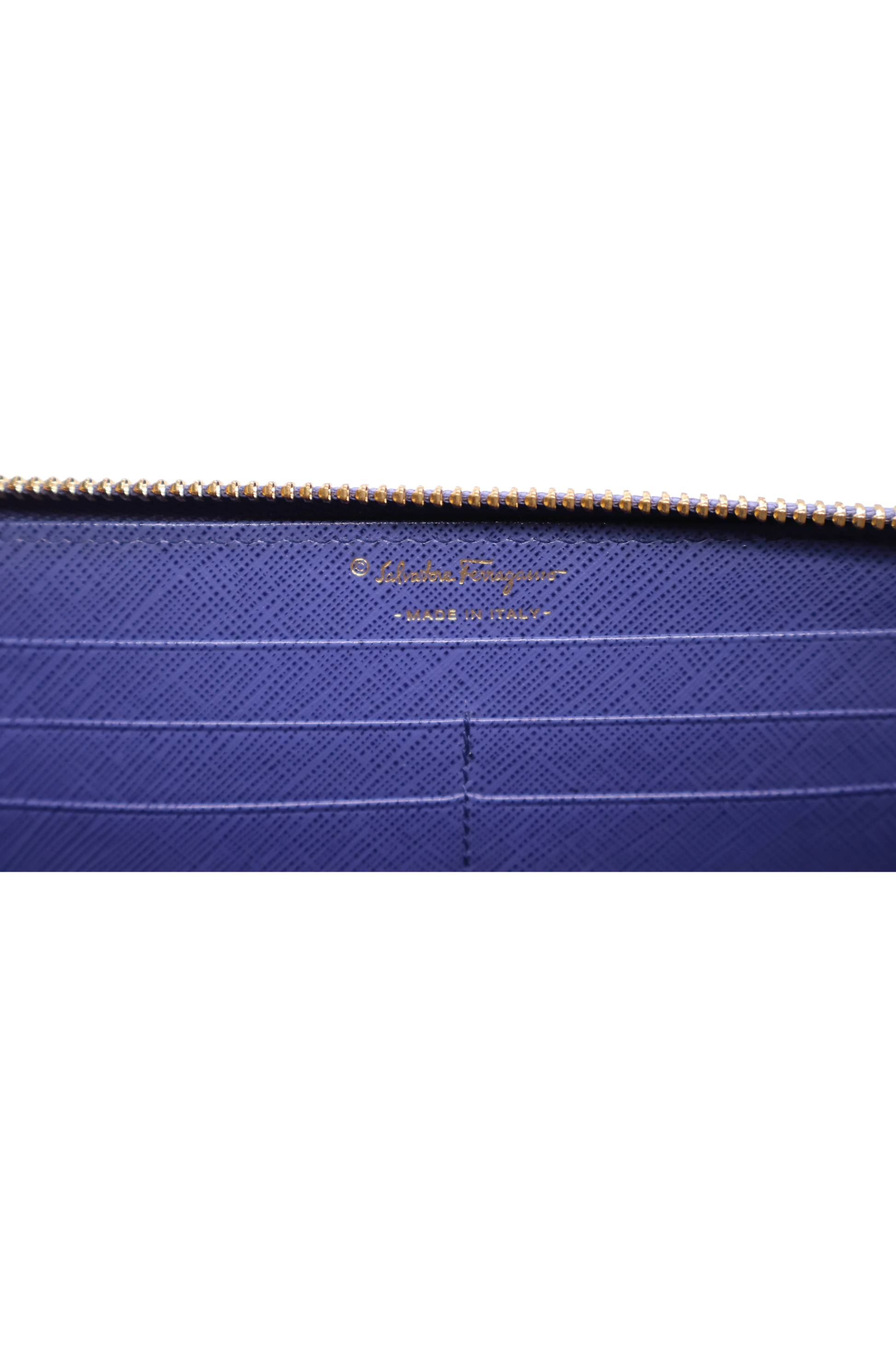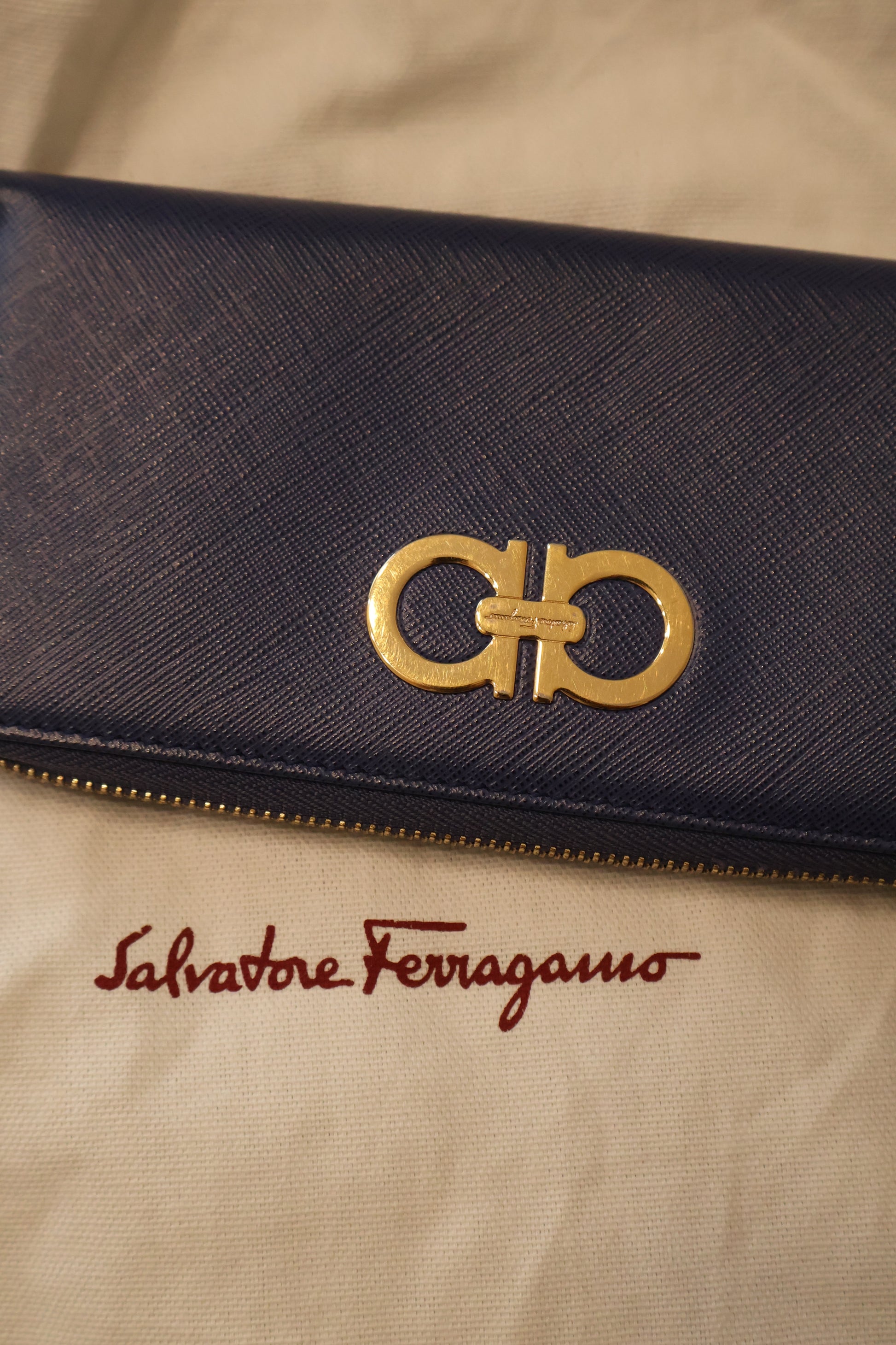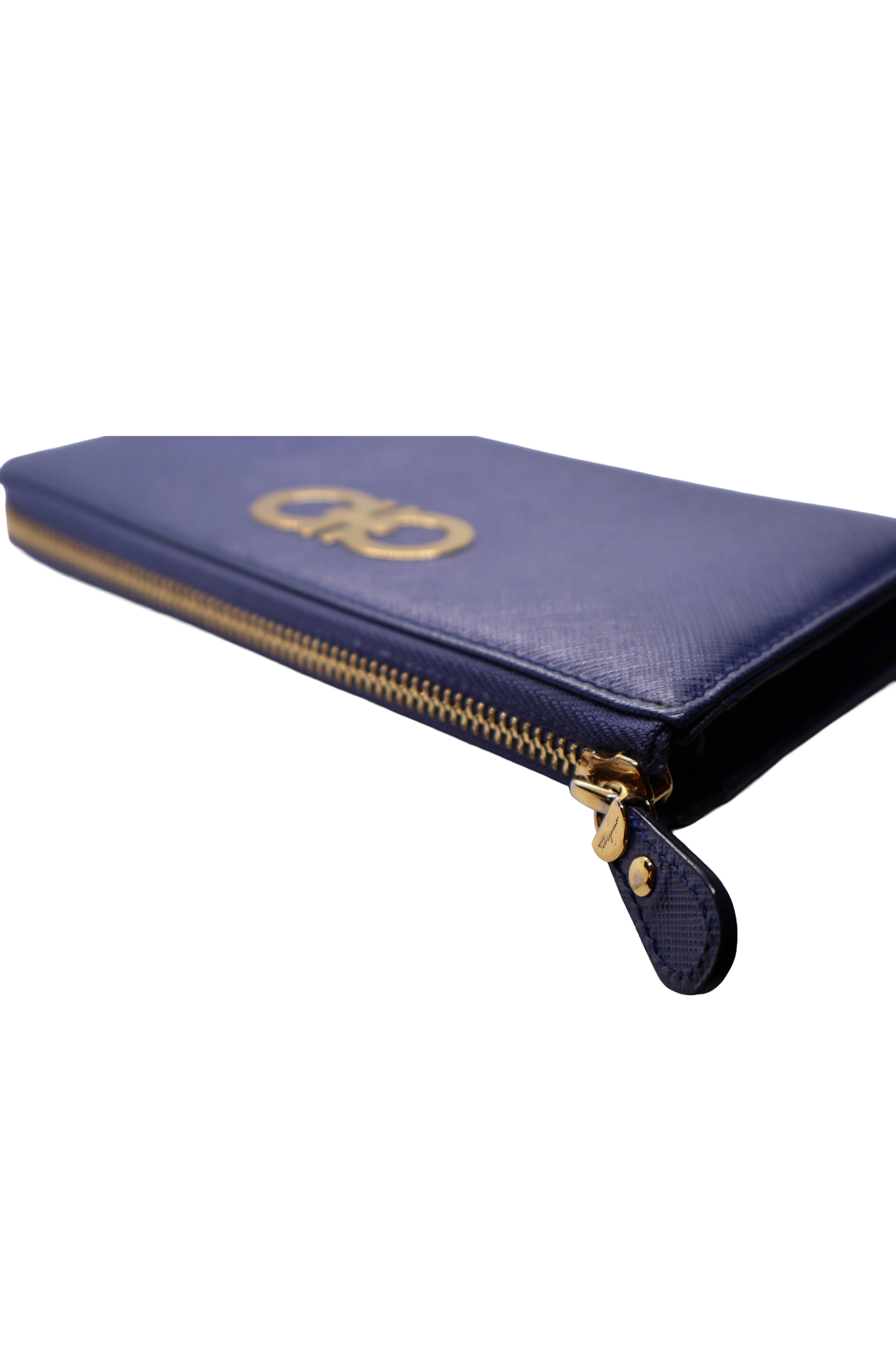Elegant and practical, this Salvatore Ferragamo Gancini wallet features durable canvas in a striking blue shade with gold-tone hardware. In excellent condition and comes with its original dustbag. A sophisticated accessory perfect for everyday use.